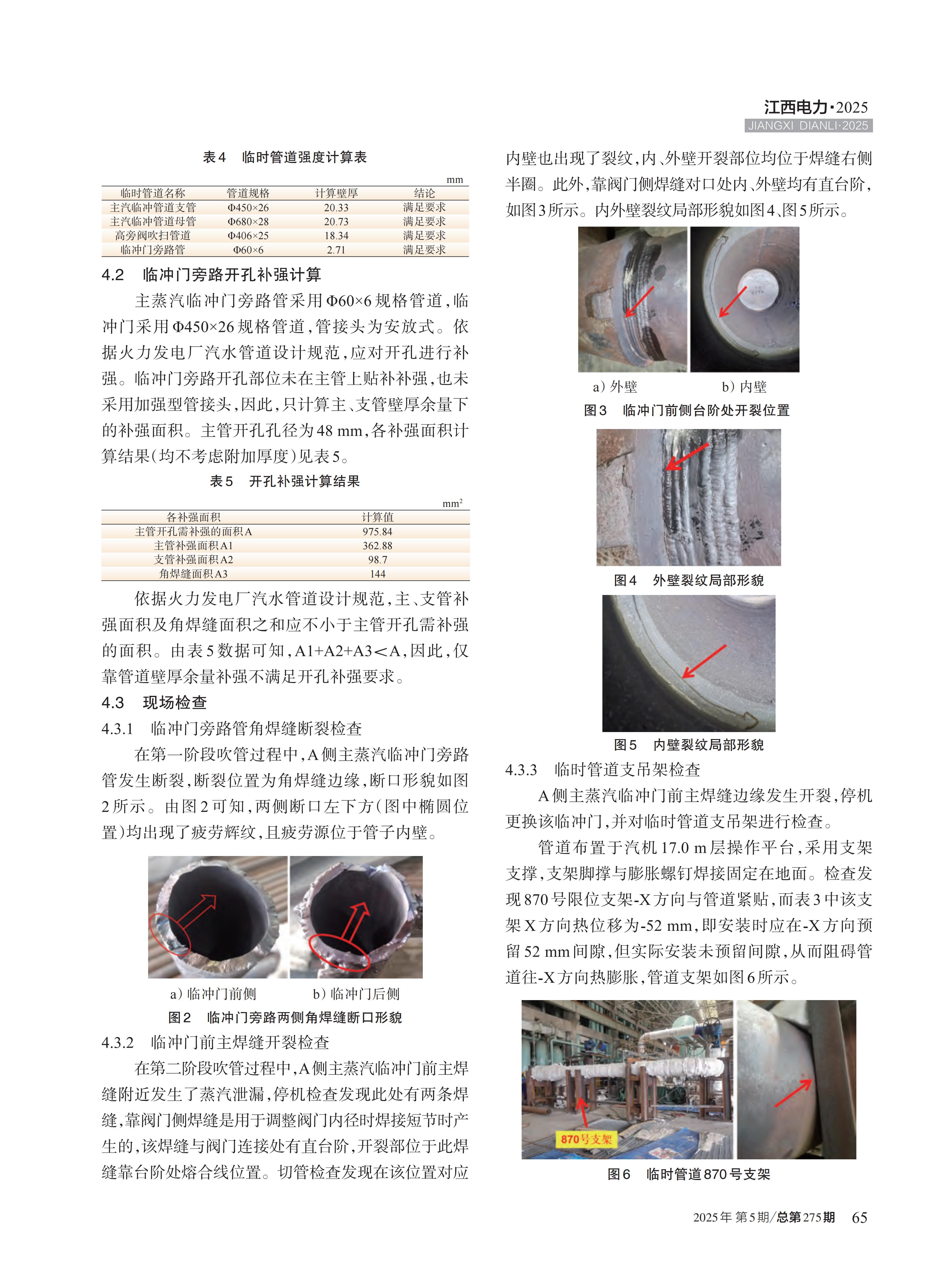 针对某1000 MW超超临界二次再热电站锅炉采用将过热器、再热器串联的一段降压蒸汽吹管方案,在吹管 过程中陆续发生两处焊缝开裂现象。通过检查支吊架和失效部位,对临吹管道进行强度计算,分析了两次开裂的 原因。结果表明,两处焊缝开裂均与多次循环冲管有关,其中管道角焊缝开裂与开孔未补强直接相关,主焊缝附近 开裂是临时管道支架安装不符合要求、不等厚焊接对口处理和焊缝布置不规范等多重因素导致的。