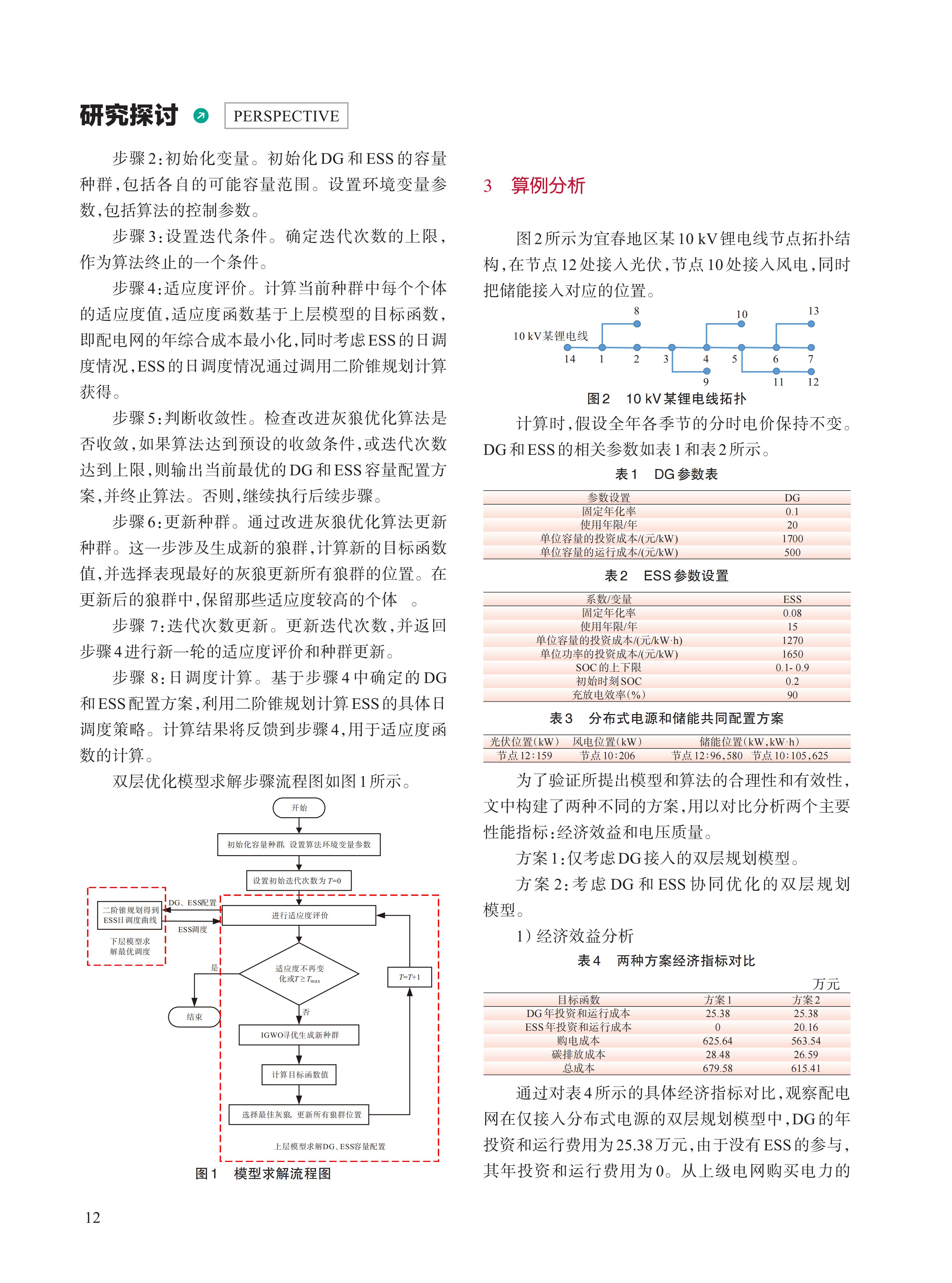 文中探讨了分布式能源(distributed energy,DG)和储能系统(energy storage systems,ESS)在配电网中的协同优化情况,以实现经济性和电压质量的双重提升。研究构建了一个双层优化模型,上层优化目标是降低年运营成本和投资成本,包括DG和ESS的费用;下层则专注于减少电网损耗。上层问题通过改进的灰狼优化算法来确定DG和 ESS 的最优容量,而下层问题则利用二阶锥规划方法,计算ESS 的日功率分配和最大输出功率。以某地区10 kV 线路为例,证明了该模型和算法的实用性,结果显示该方法能够显著提高系统的经济性和电压水平。
