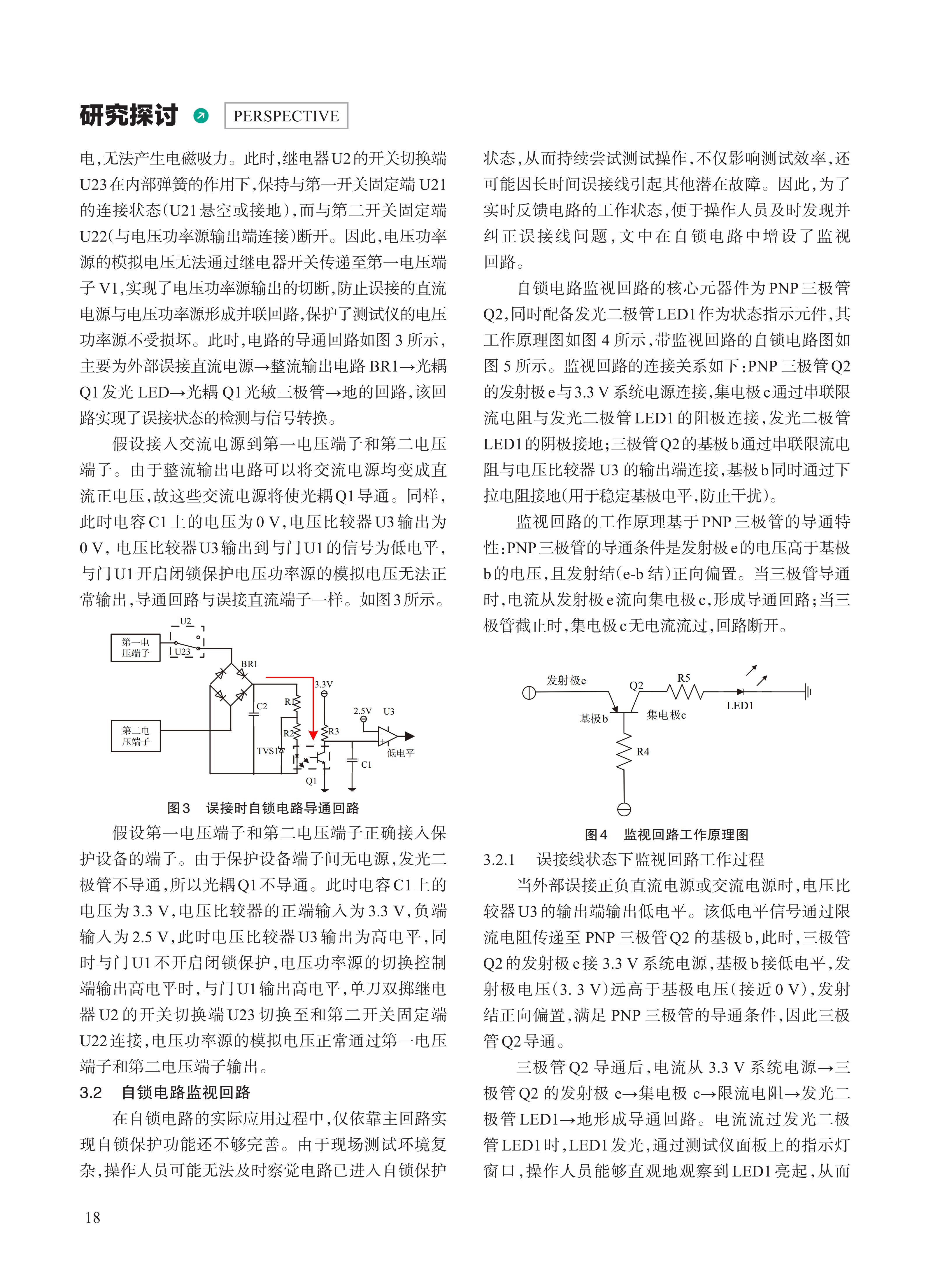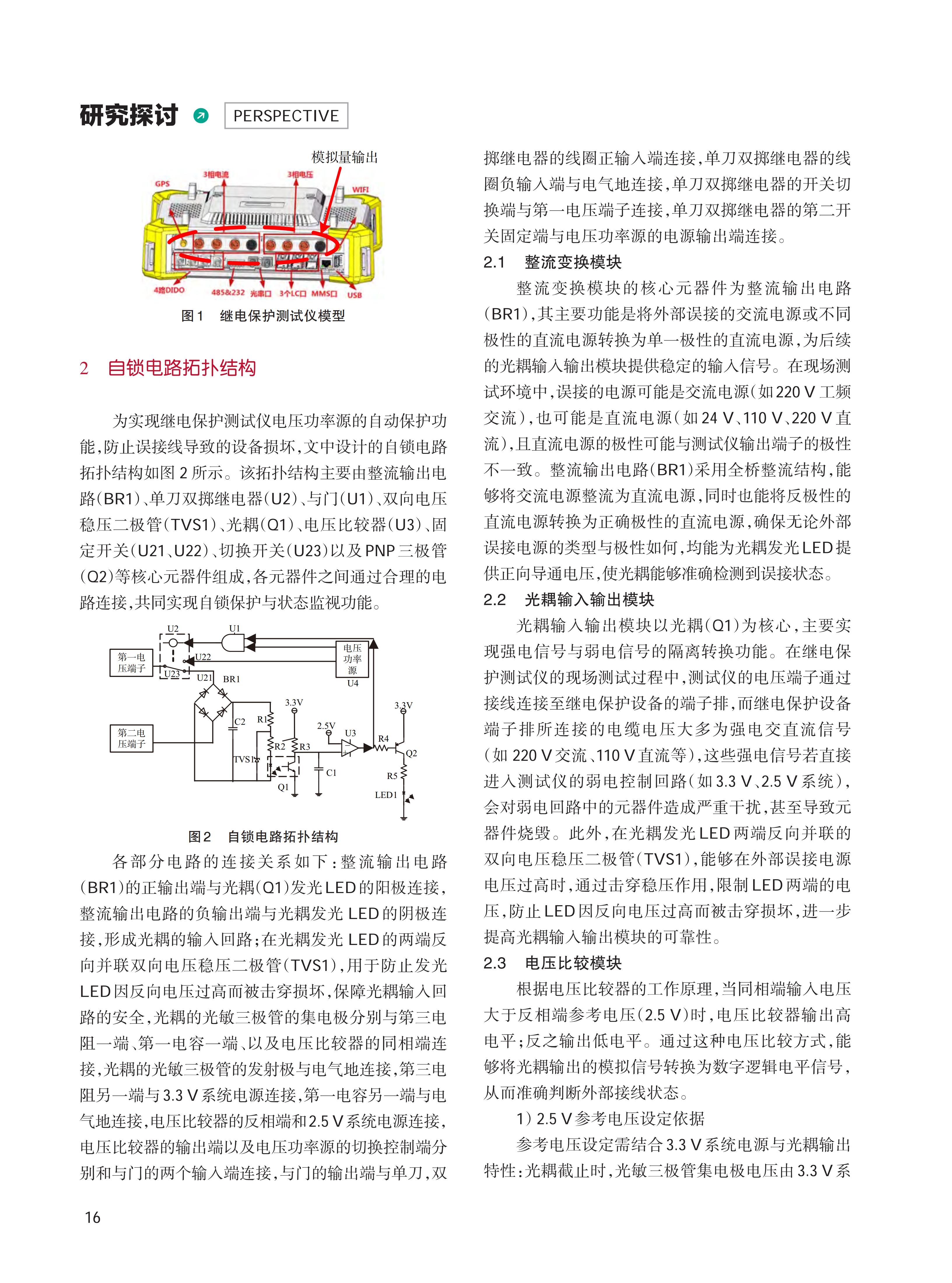 在电力系统的日常运维与故障检测工作中,继电保护测试仪作为核心检测设备,其稳定运行直接关系到电力保护装置性能评估的准确性与电力系统的安全可靠性。然而,在现场复杂的测试环境中,由于作业场地空间有限、测试线缆种类繁杂且标识易磨损、操作人员技能水平参差不齐以及测试任务时间紧迫等多重因素叠加,常常出现模拟量输出端子误接至其他电源输出的情况,致使测试仪损坏。文中提出一种继电保护测试仪电压功率源自锁保护电路,光耦元件及电压比较器组成简单逻辑输出,可有效防止继电保护测试仪将模拟量并接至其他电源,同时利用三极管为自锁电路提供误接监视回路。该电路结构简单、成本低、可靠性较高。
