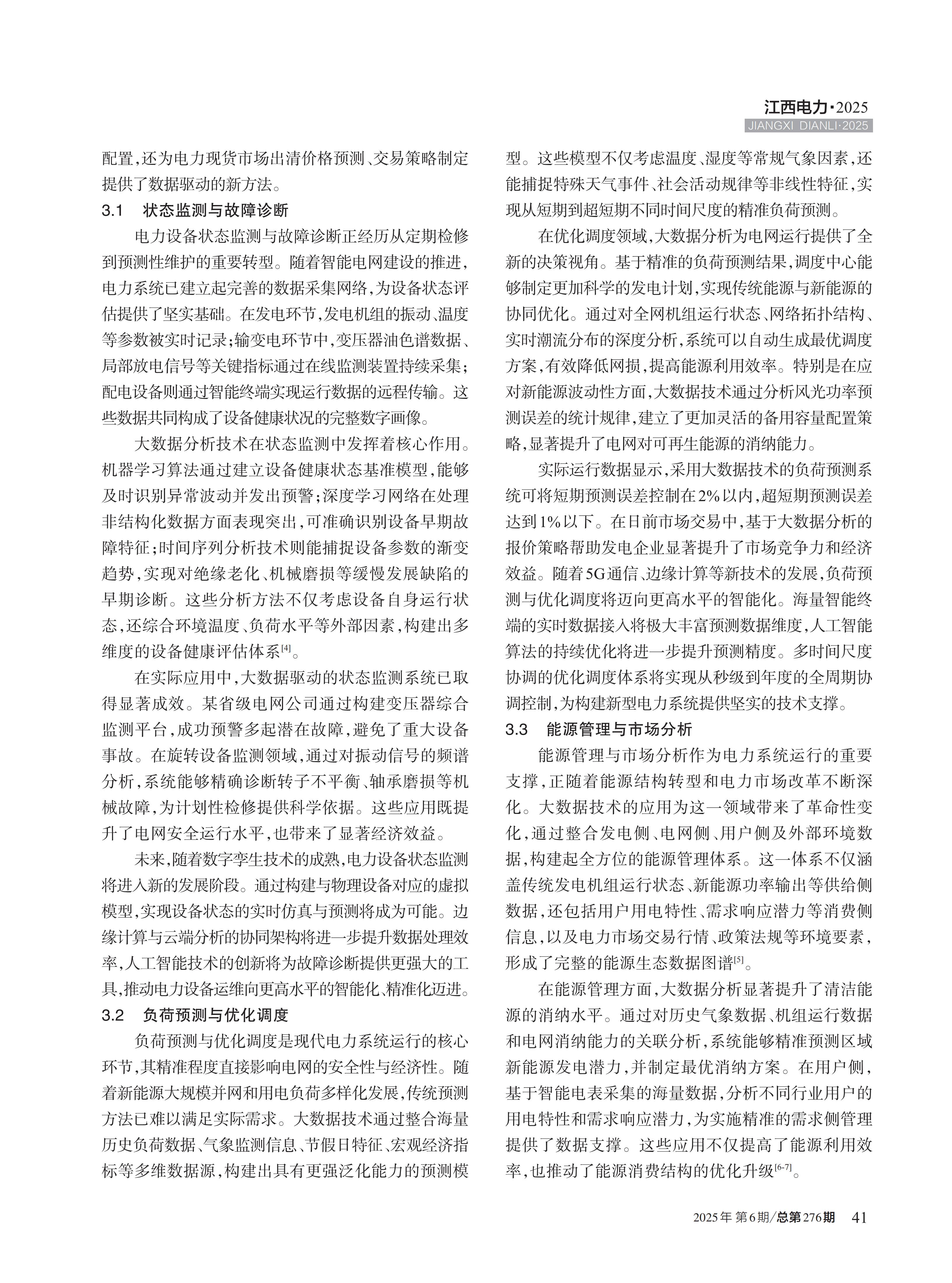 随着新型电力系统建设的推进,源、网、荷、储各环节产生的海量数据呈现出爆炸式增长的趋势,具有规模大、类型多、速度快、价值密度低等特点 。文中系统探讨了大数据技术在电力系统中的创新应用与发展前景,总结了电力大数据的关键技术,综述了在状态监测与故障诊断、负荷预测与优化调度、能源管理与市场分析三大核心领域的研究现状 。虽然大数据技术已显著提升电网运行效率和安全性,但在数据质量、系统集成等方面仍面临挑战。未来,随着数字孪生、人工智能等新技术融合发展,大数据技术将持续推动电力系统向数字化、智能化方向转型升级,为构建新型电力系统提供关键技术支撑。