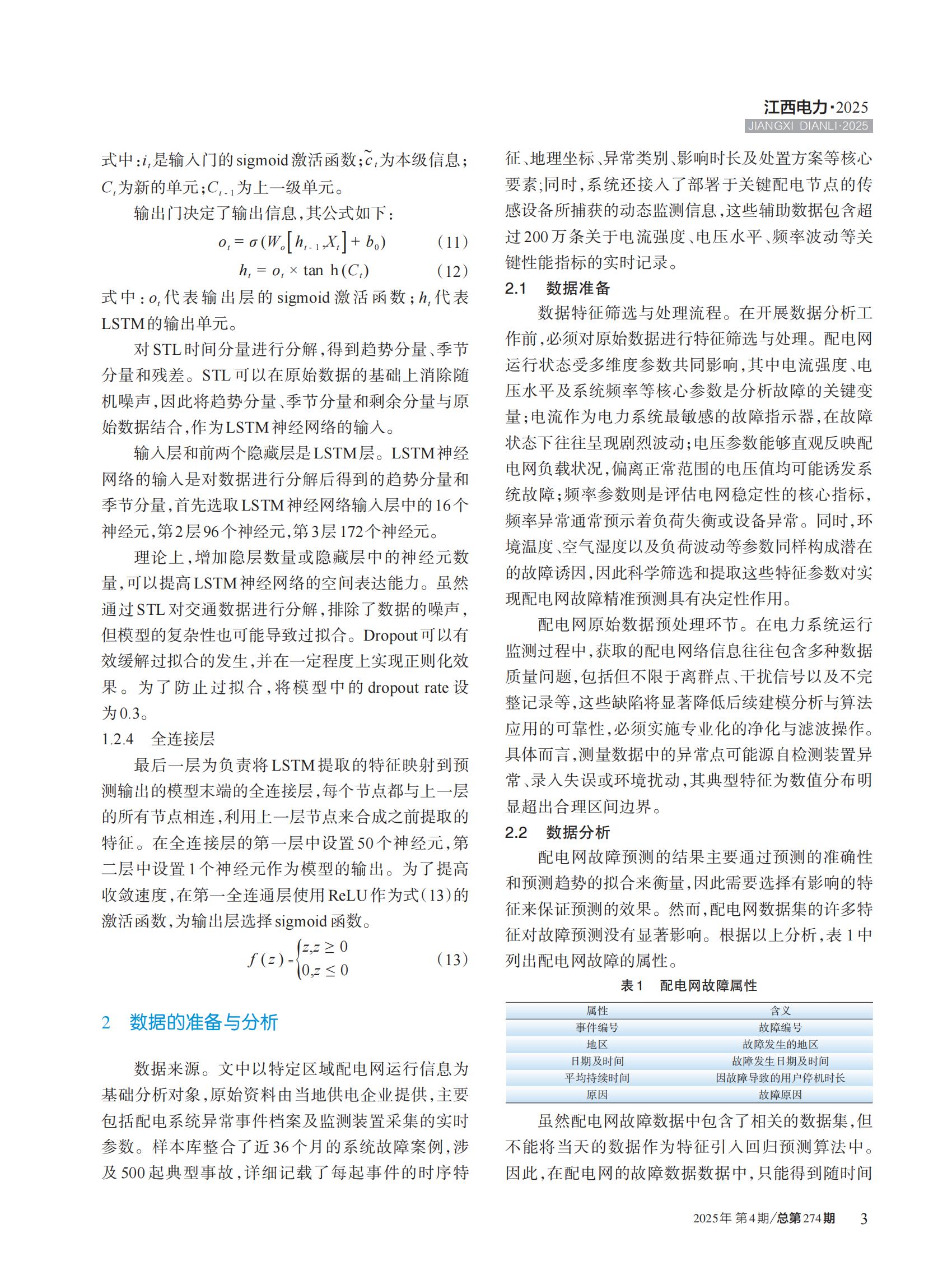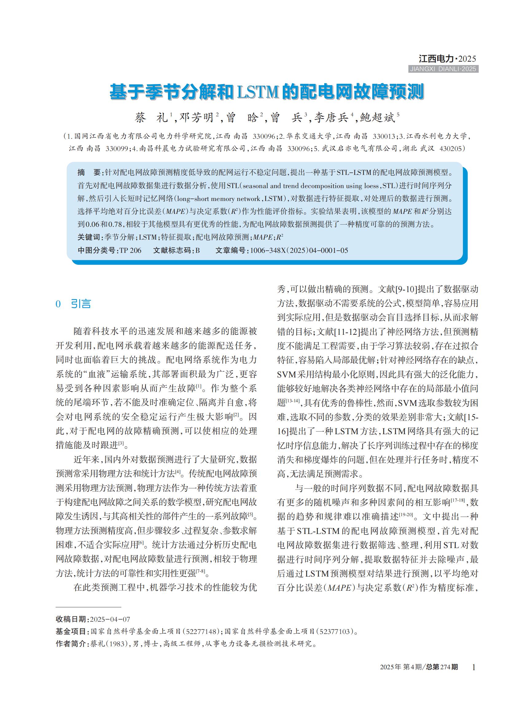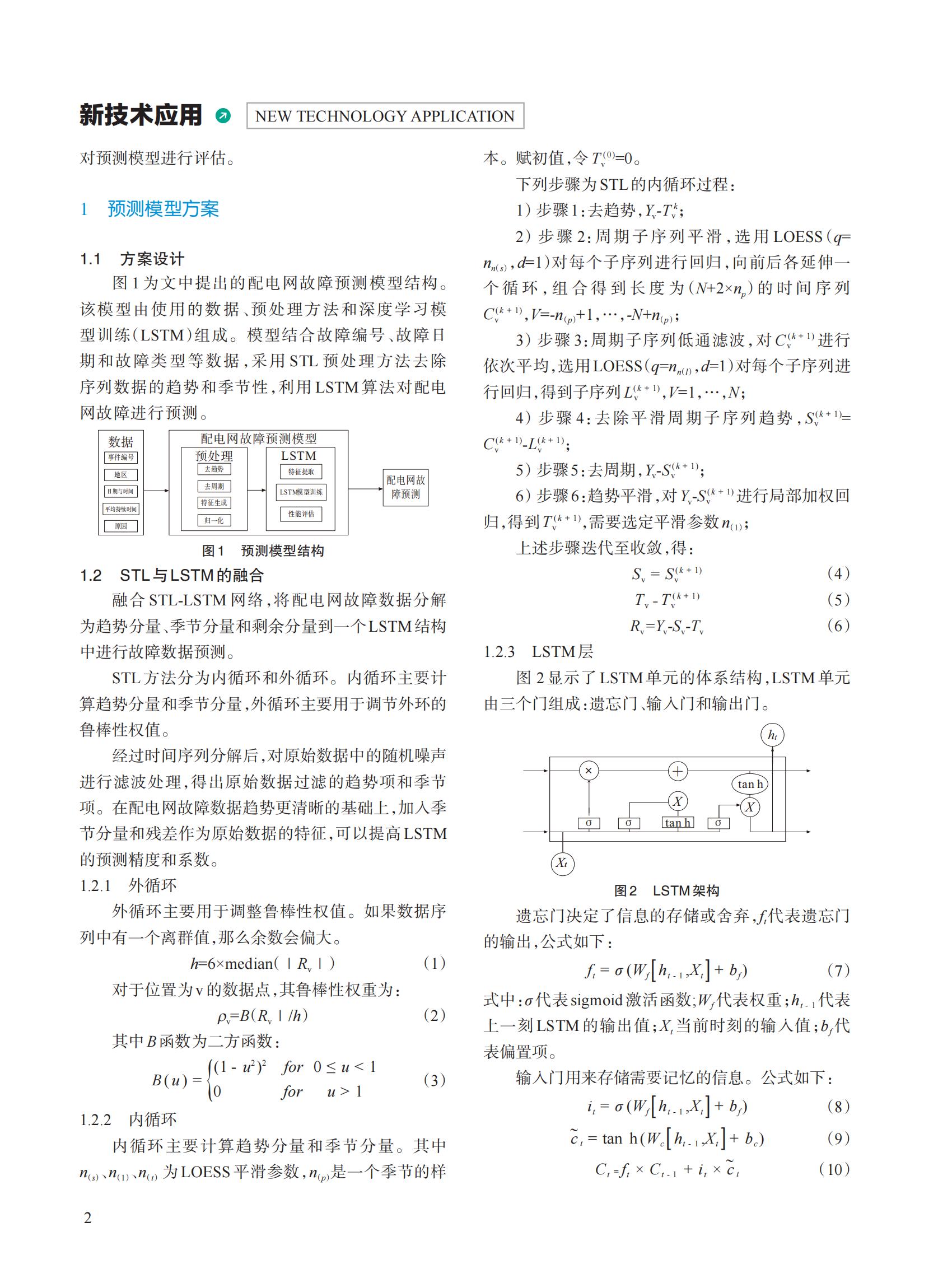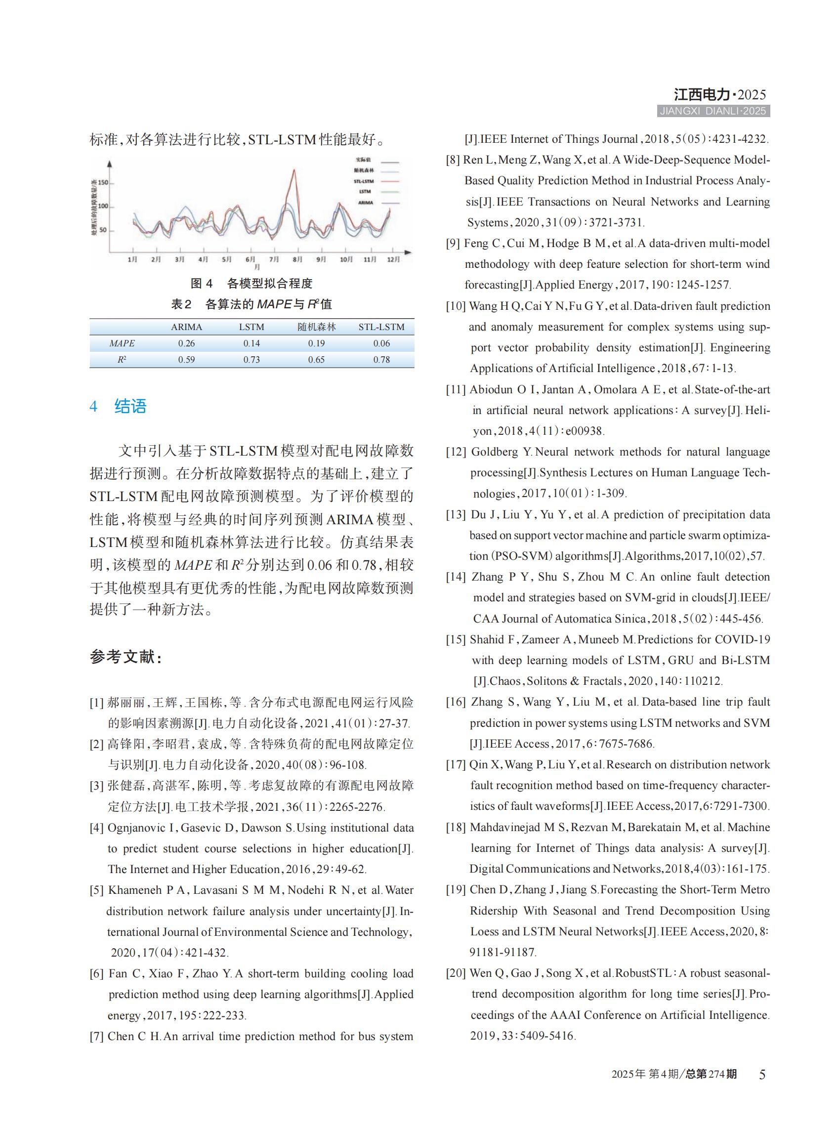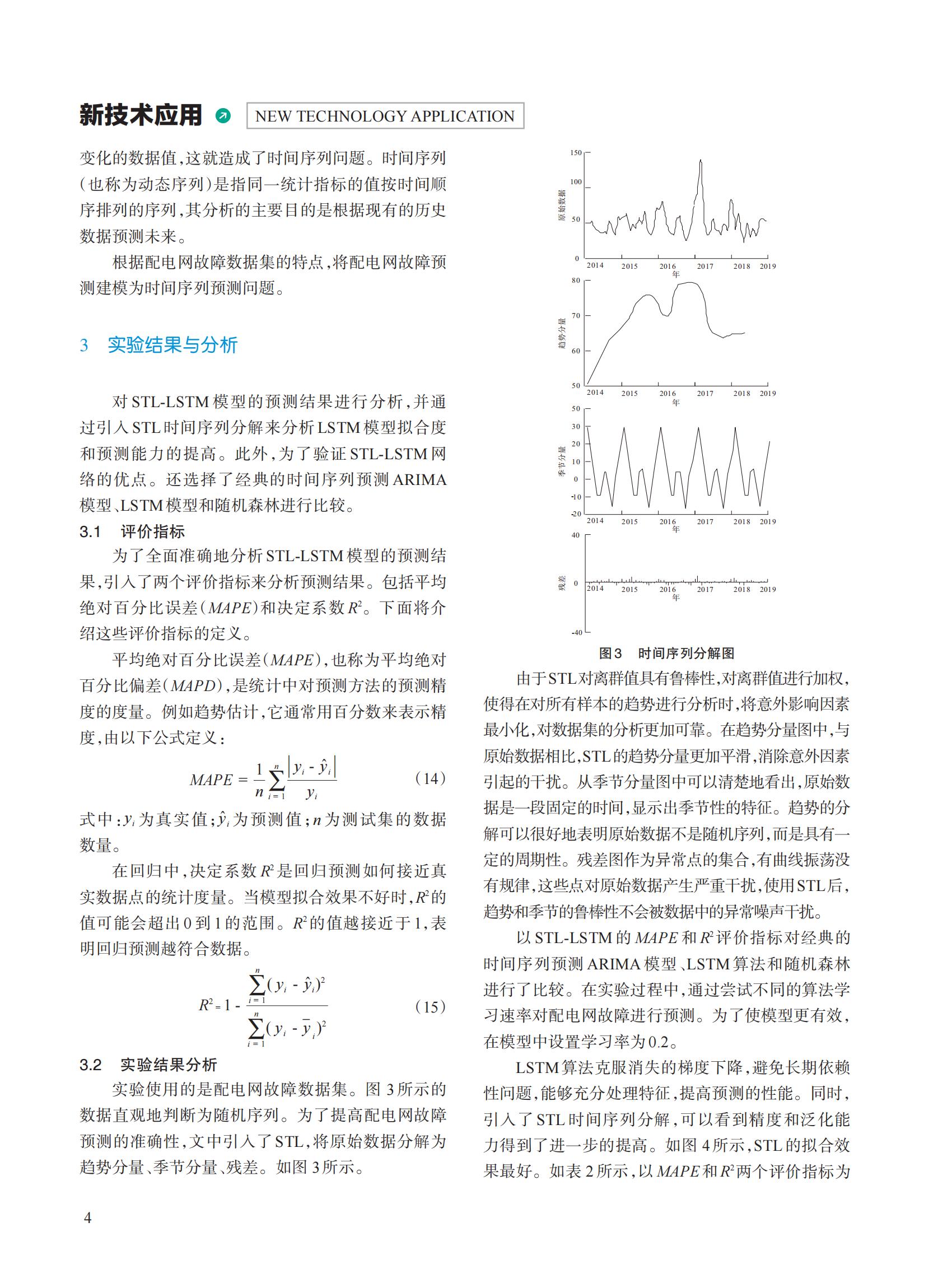 针对配电网故障预测精度低导致的配网运行不稳定问题,提出一种基于 STL-LSTM 的配电网故障预测模型。 首先对配电网故障数据集进行数据分析,使用 STL(seasonal and trend decomposition using loess,STL)进行时间序列分 解,然后引入长短时记忆网络(long-short memory network,LSTM),对数据进行特征提取,对处理后的数据进行预测。 选择平均绝对百分比误差(MAPE)与决定系数(R2)作为性能评价指标 。实验结果表明,该模型的 MAPE 和 R2 分别达 到 0.06 和 0.78,相较于其他模型具有更优秀的性能,为配电网故障数据预测提供了一种精度可靠的的预测方法。