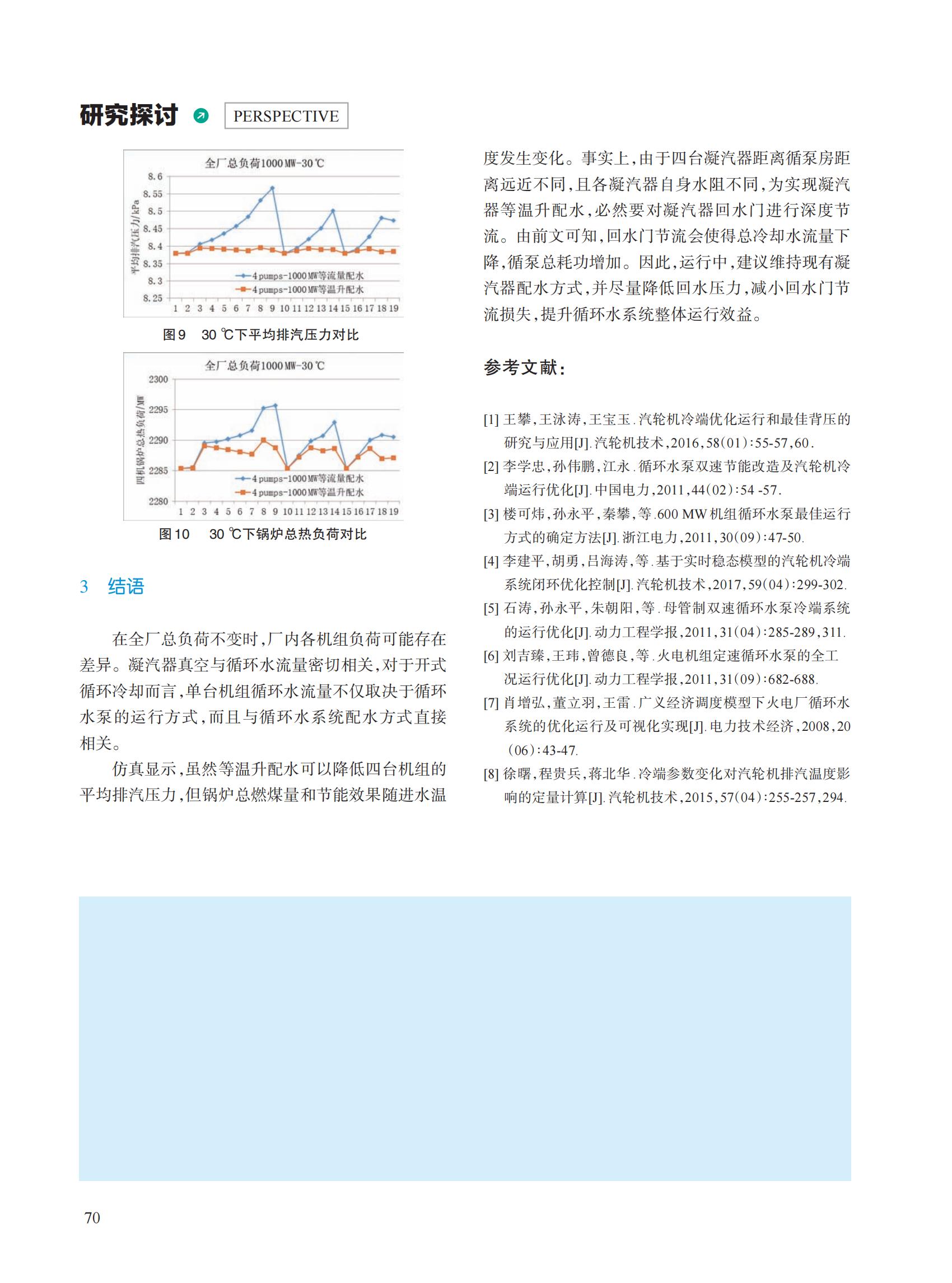[1] 王攀,王泳涛,王宝玉 . 汽轮机冷端优化运行和最佳背压的 研究与应用[J]. 汽轮机技术,2016,58(01)∶55-57,60. [2] 李学忠,孙伟鹏,江永 . 循环水泵双速节能改造及汽轮机冷 端运行优化[J]. 中国电力,2011,44(02)∶54 -57. [3] 楼可炜,孙永平,秦攀,等 .600 MW机组循环水泵最佳运行 方式的确定方法[J]. 浙江电力,2011,30(09)∶47-50. [4] 李建平,胡勇,吕海涛,等 . 基于实时稳态模型的汽轮机冷端 系统闭环优化控制[J]. 汽轮机技术,2017,59(04)∶299-302. [5] 石涛,孙永平,朱朝阳,等 . 母管制双速循环水泵冷端系统 的运行优化[J]. 动力工程学报,2011,31(04)∶285-289,311. [6] 刘吉臻,王玮,曾德良,等 . 火电机组定速循环水泵的全工 况运行优化[J]. 动力工程学报,2011,31(09)∶682-688. [7] 肖增弘,董立羽,王雷 . 广义经济调度模型下火电厂循环水 系统的优化运行及可视化实现[J]. 电力技术经济,2008,20(06)∶43-47. [8] 徐曙,程贵兵,蒋北华 . 冷端参数变化对汽轮机排汽温度影 响的定量计算[J]. 汽轮机技术,2015,57(04)∶255-257,294.