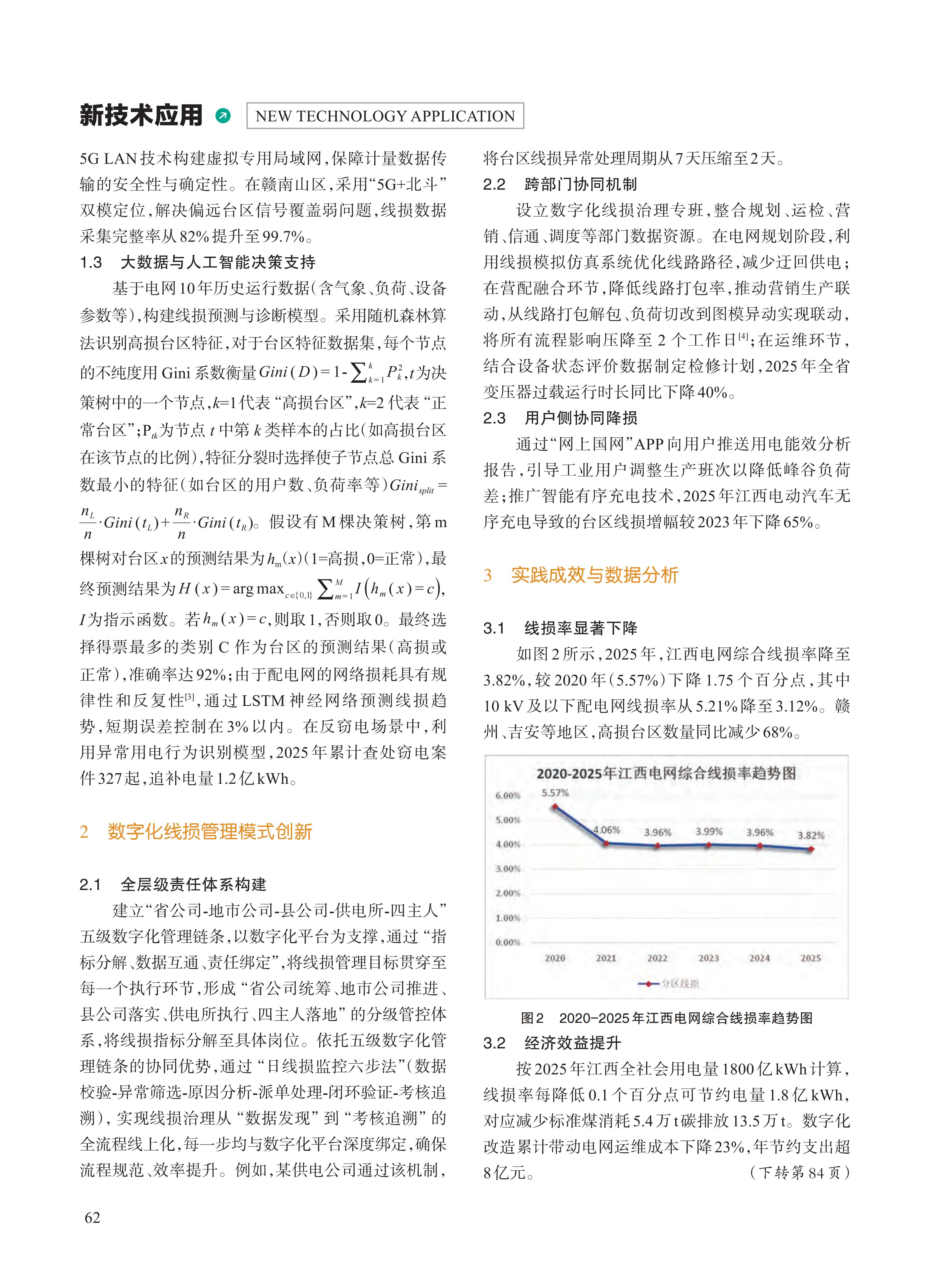 线损率是衡量电网运营效率的核心指标,数字化技术为线损治理提供了精准化、智能化解决方案。对于供 电企业而言,控制线损可起到降低输配电成本的效果,间接提高供电公司的经济效益。文中以江西电网为研究对 象,系统梳理数字化降线损的技术架构与管理模式创新。通过分析智能监测系统、5G+物联网感知网络、大数据与 人工智能决策平台的应用实践,结合全层级管理体系与跨部门协同机制的构建,揭示数字化技术在台区线损精准 定位、设备状态预警、窃电行为识别等场景的降损效能。研究表明,江西电网通过数字化转型,综合线损率较传统 模式降低1.5 ~ 2个百分点,年节约电量超10亿kWh,为新型电力系统下的线损治理提供了可推广的实践经验。