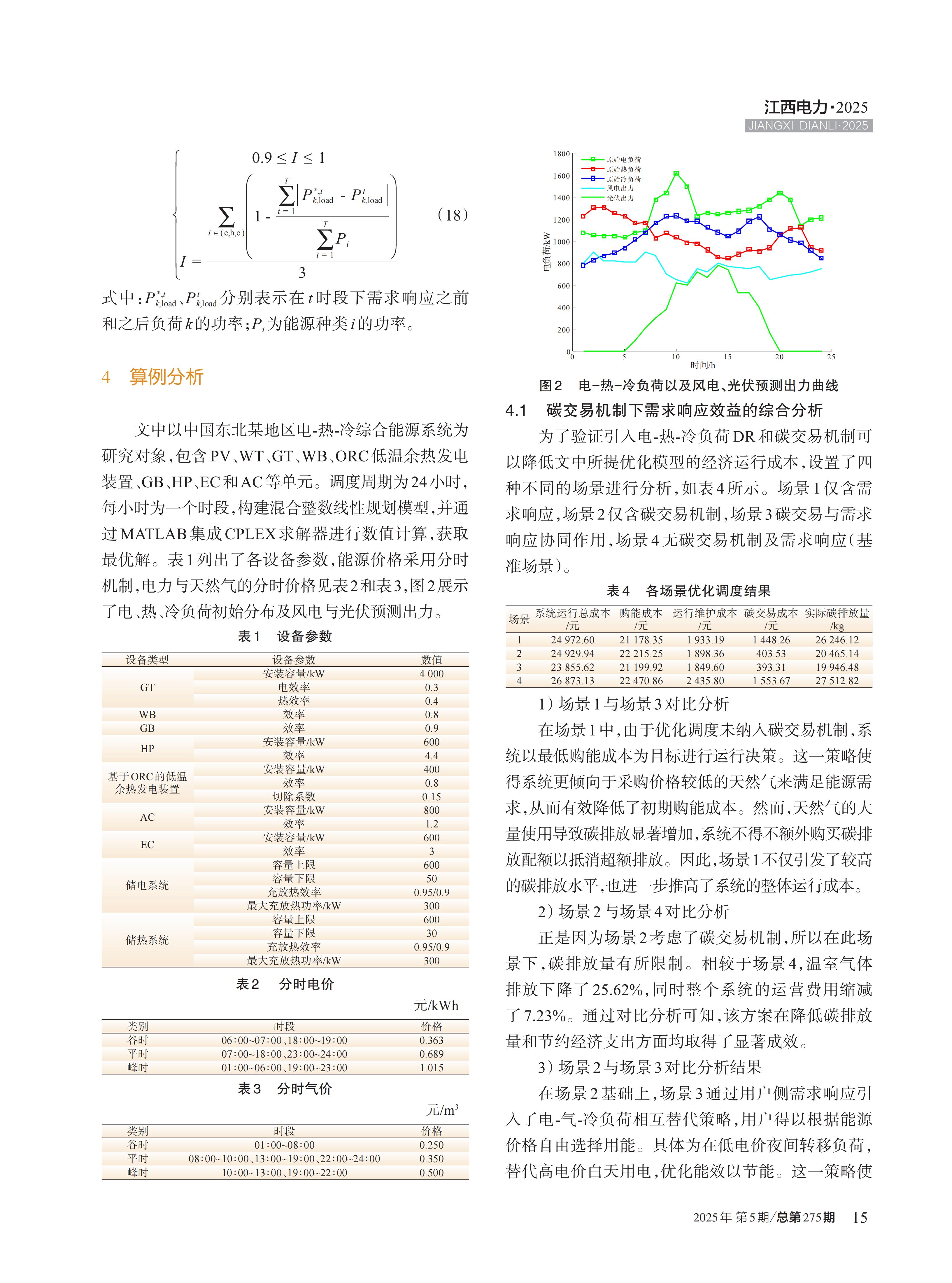 在全球能源低碳化转型背景下,综合能源系统(integrated energy system,IES)作为提升能效和促进清洁能源消 纳的重要手段,受到广泛关注。为实现系统低碳经济运行,文中将需求响应与碳交易机制引入IES优化调度中。首先, 基于电-热-冷负荷的协同互补特性,构建了多能协同的需求响应模型;其次,结合燃气轮机与燃气锅炉的碳排放特征, 采用基准线法分配无偿碳配额,并建立碳交易模型;最终,以最小化购能成本、碳交易成本、维护成本及弃风、弃光成本 为目标,构建了电-热-冷IES优化调度模型,并转化为混合整数线性规划问题,通过CPLEX求解。算例分析设置4种 场景,结果表明:引入碳交易后系统总成本降低7.23%;进一步加入需求响应后,运行成本再降4.31%。仿真结果还显 示,需求响应与碳交易协同可有效实现负荷灵活转移,减少天然气消耗,显著降低碳排放,具有良好的应用前景。