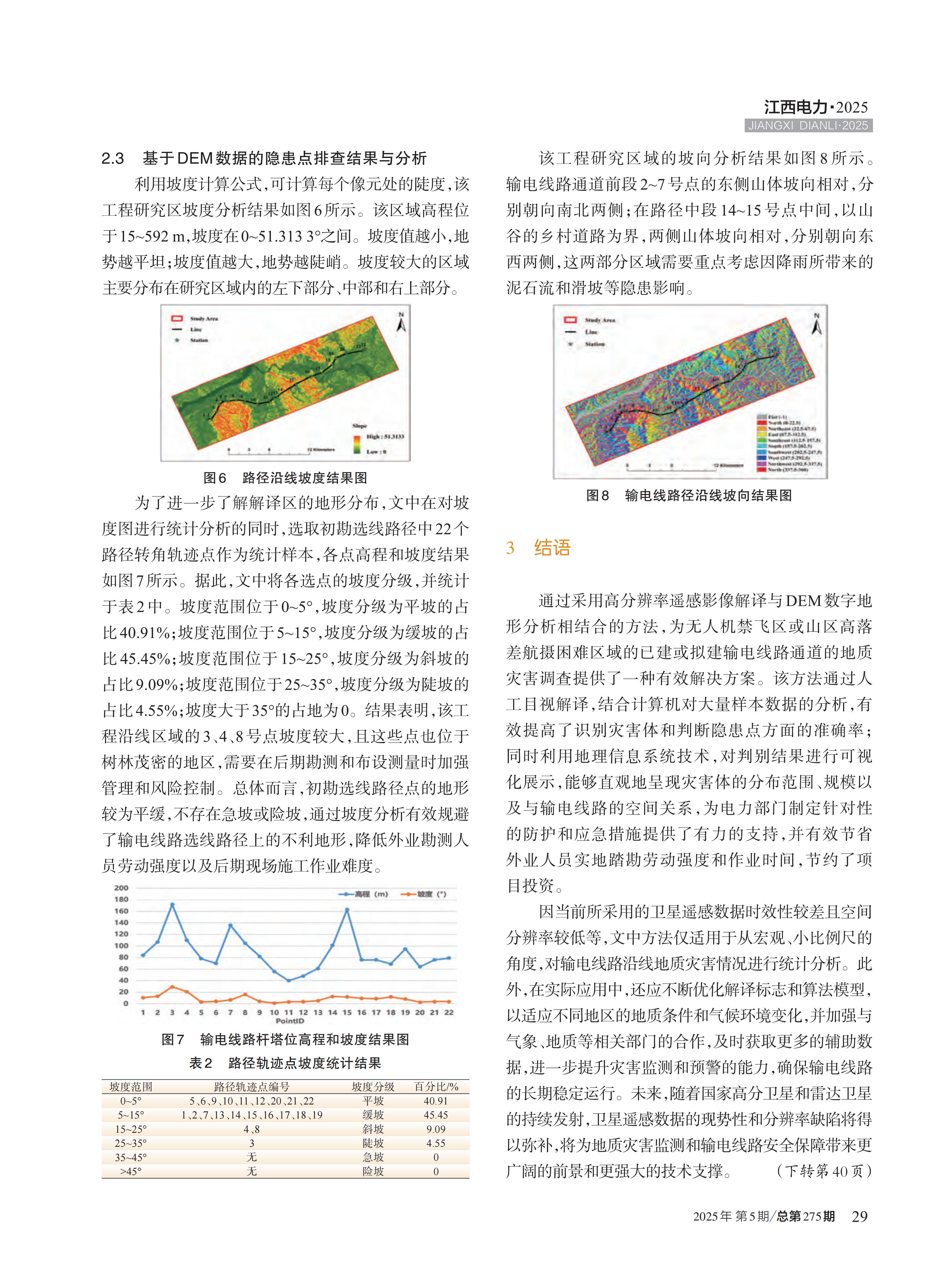 地质灾害体发生点和隐患点的排查是保障输电线路工程安全、稳定、经济运行的重要环节之一。针对无人机 禁飞区以及航摄困难地区存在的影像数据采集受限和监测难度大等问题,文中采用Landsat-9高分辨率光学遥感影 像,分析滑坡、崩塌和泥石流等灾害体影像特征并建立解译标志,识别出已建或拟建输电线路通道的已发生灾害体, 结合数字高程模型(digital elevation model,DEM)数字地形计算坡度、坡向辅助判断灾害隐患点。实验结果表明,文中 所述工程利用该技术,识别4处杆塔处于滑坡和泥石流隐患区,从而有效弥补了部分区域无人机无法作业的缺陷,减 少了人力现场踏勘劳动强度,为地质灾害体的识别和隐患排查提供了重要的数据支持。