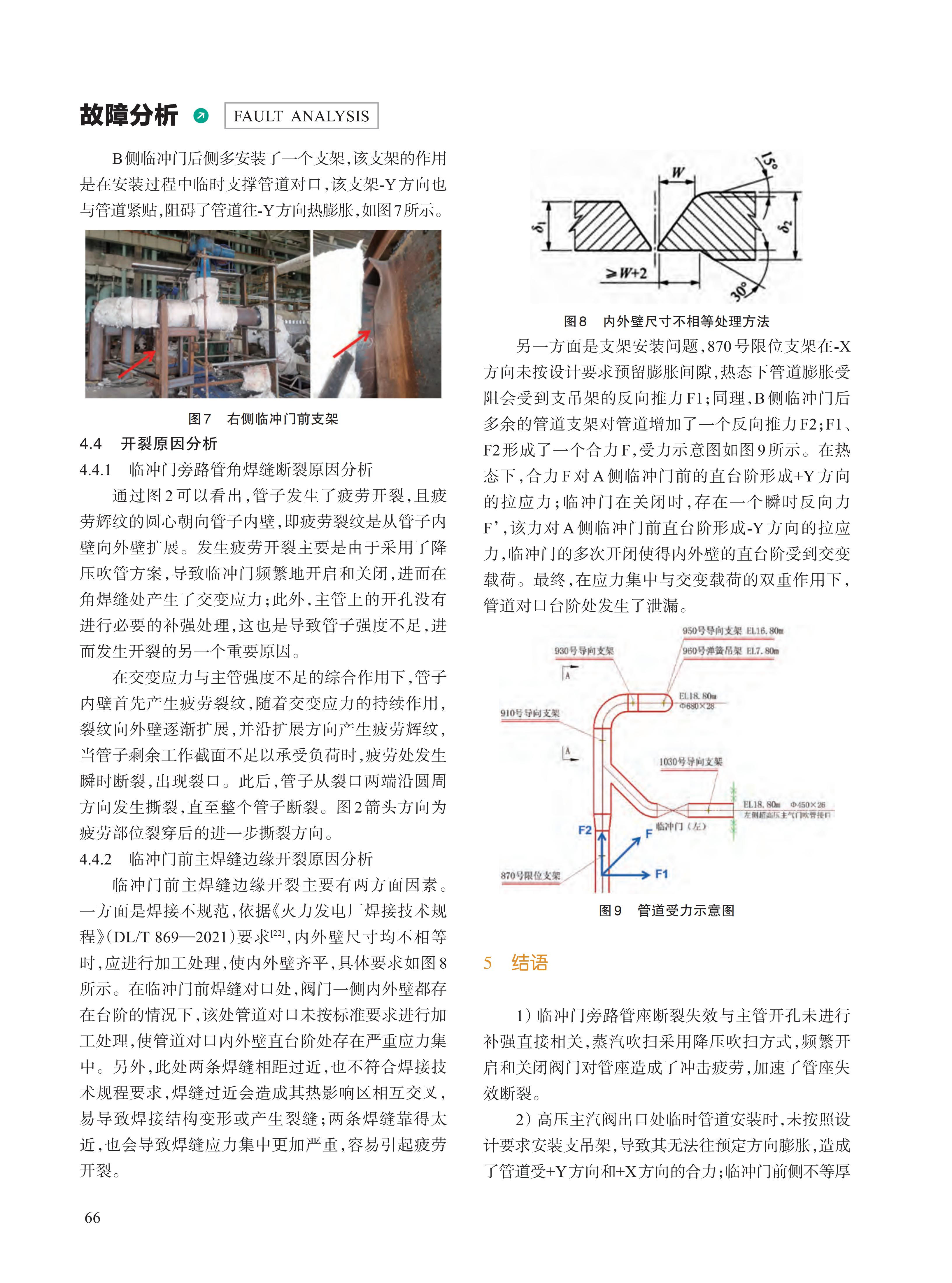 针对某1000 MW超超临界二次再热电站锅炉采用将过热器、再热器串联的一段降压蒸汽吹管方案,在吹管 过程中陆续发生两处焊缝开裂现象。通过检查支吊架和失效部位,对临吹管道进行强度计算,分析了两次开裂的 原因。结果表明,两处焊缝开裂均与多次循环冲管有关,其中管道角焊缝开裂与开孔未补强直接相关,主焊缝附近 开裂是临时管道支架安装不符合要求、不等厚焊接对口处理和焊缝布置不规范等多重因素导致的。