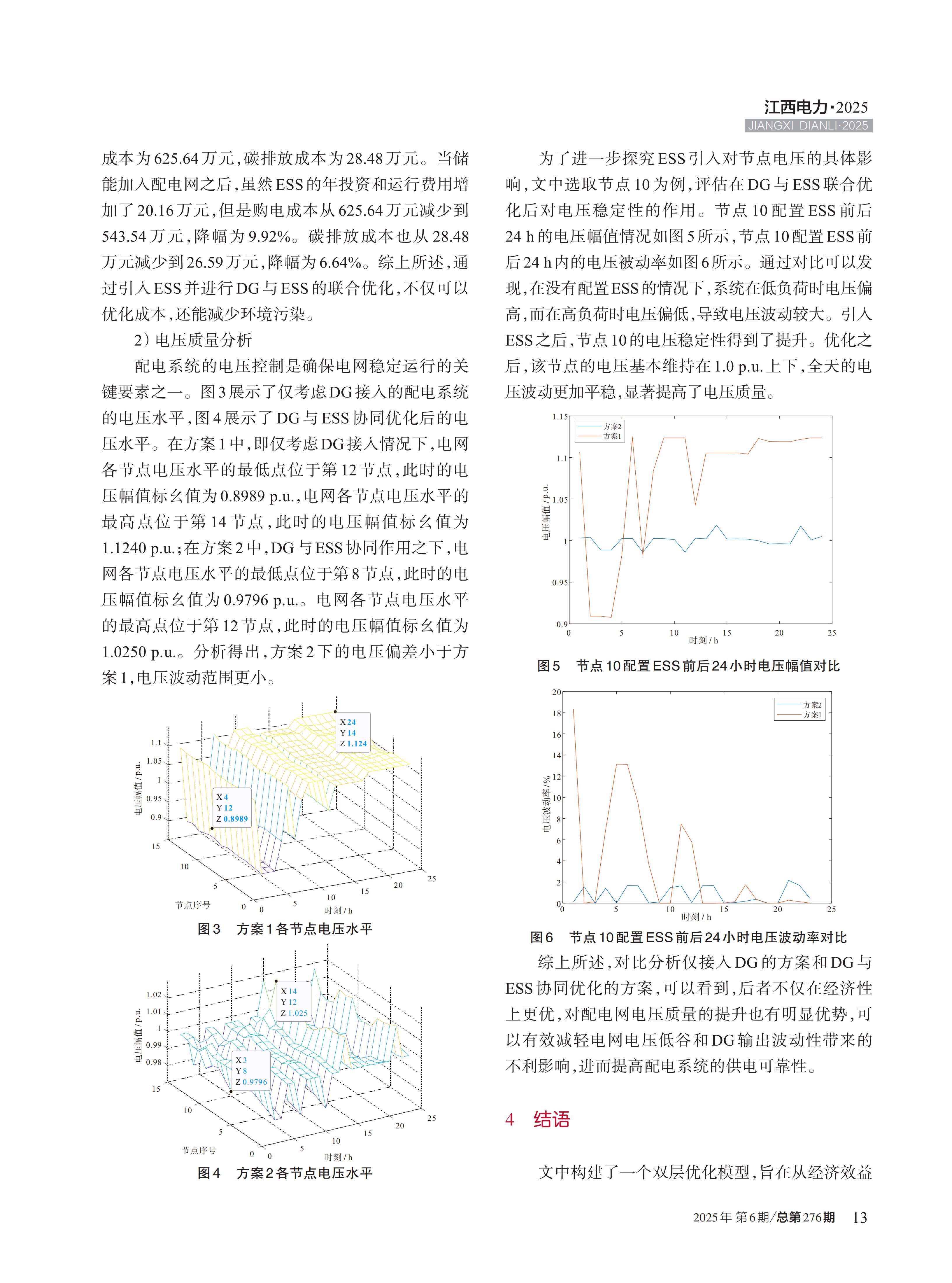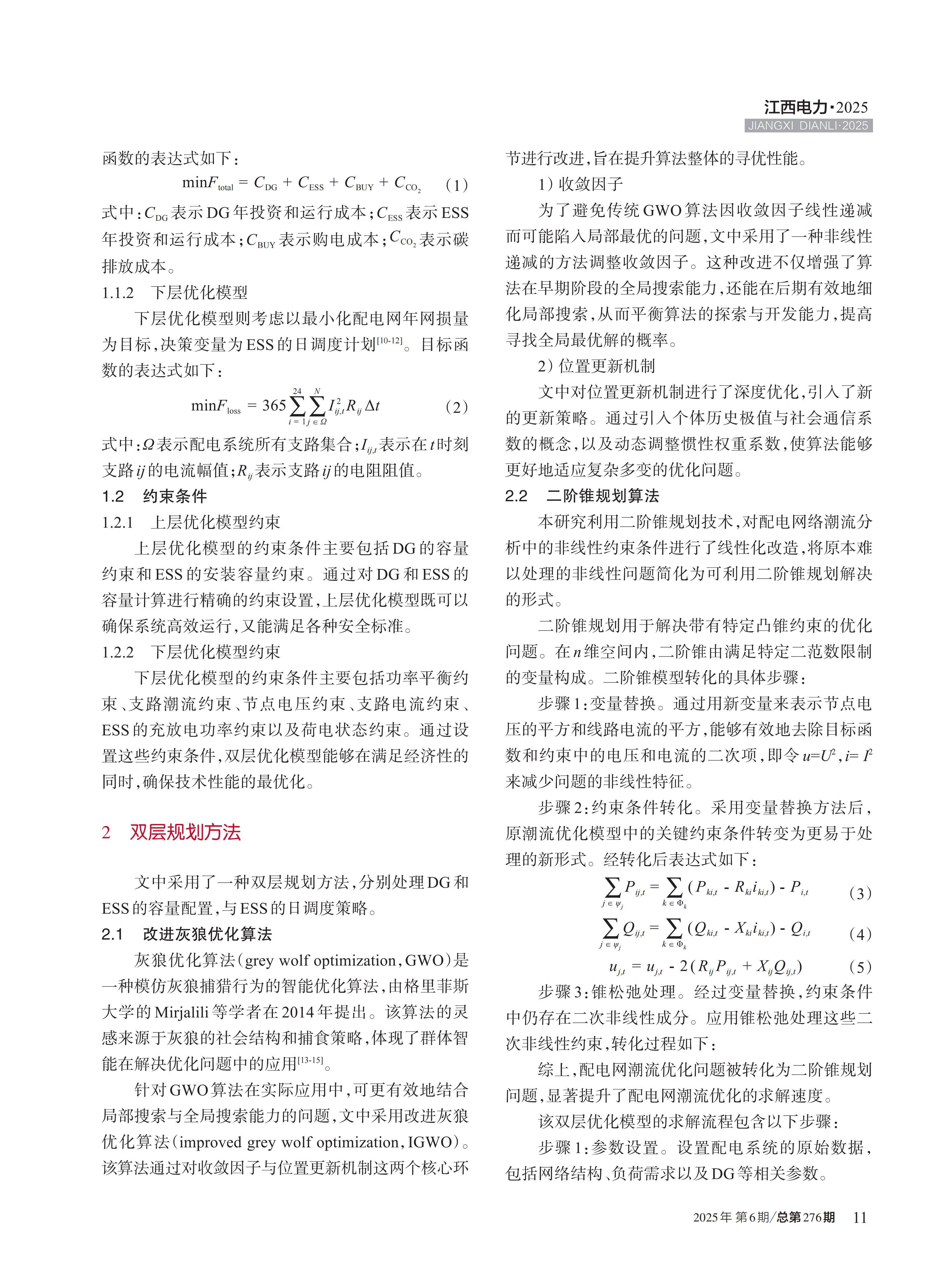 文中探讨了分布式能源(distributed energy,DG)和储能系统(energy storage systems,ESS)在配电网中的协同优化情况,以实现经济性和电压质量的双重提升。研究构建了一个双层优化模型,上层优化目标是降低年运营成本和投资成本,包括DG和ESS的费用;下层则专注于减少电网损耗。上层问题通过改进的灰狼优化算法来确定DG和 ESS 的最优容量,而下层问题则利用二阶锥规划方法,计算ESS 的日功率分配和最大输出功率。以某地区10 kV 线路为例,证明了该模型和算法的实用性,结果显示该方法能够显著提高系统的经济性和电压水平。