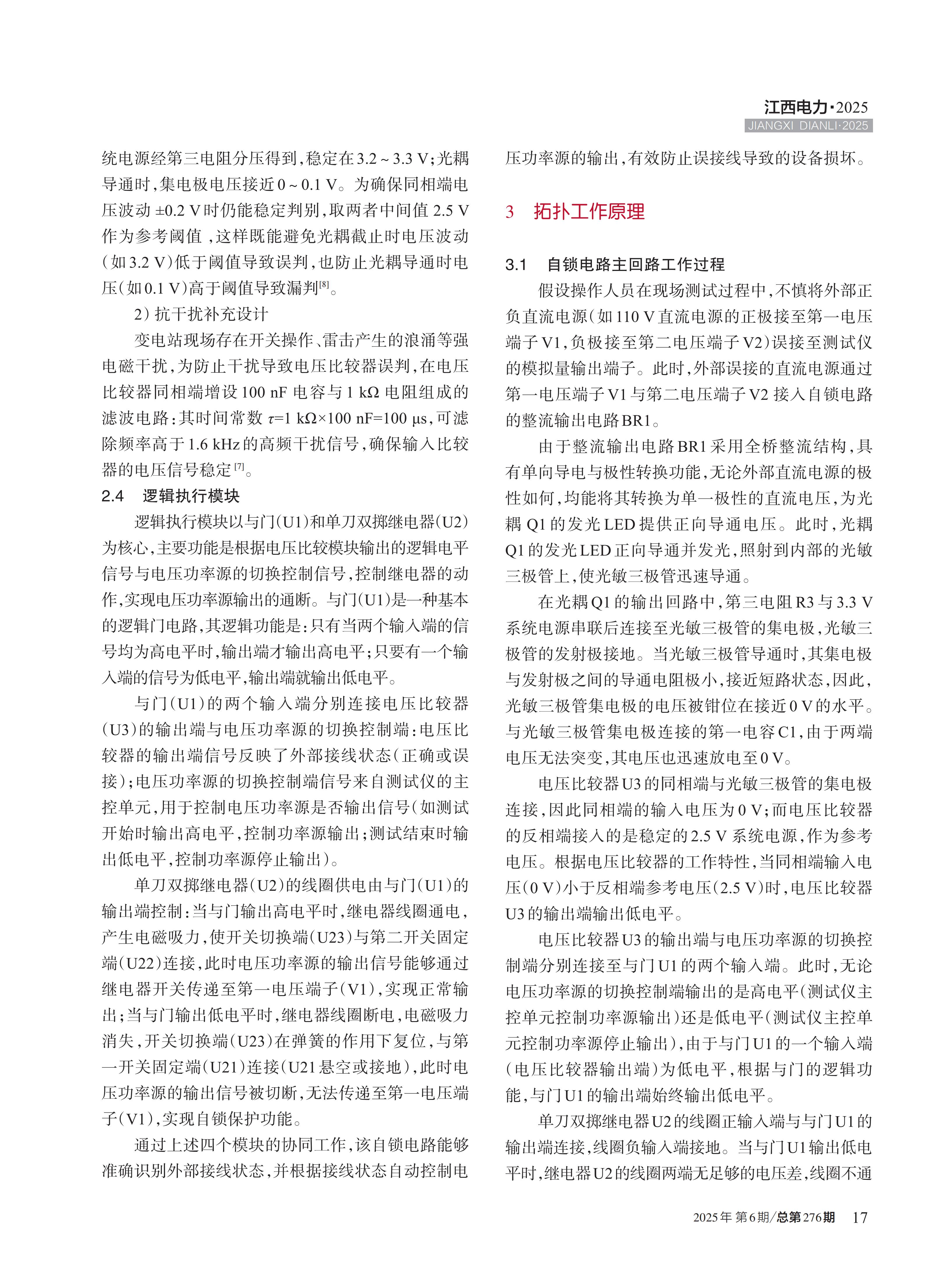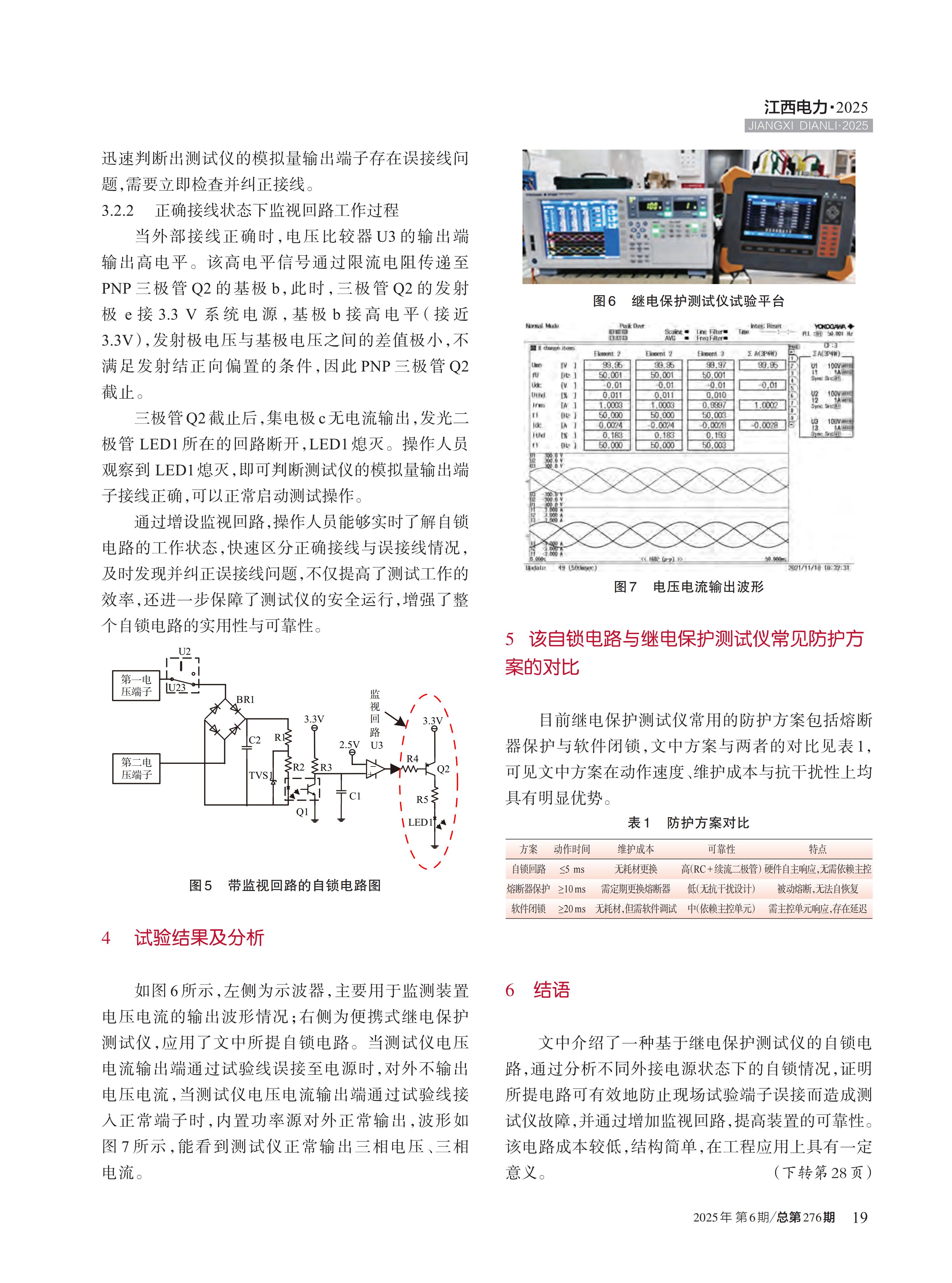在电力系统的日常运维与故障检测工作中,继电保护测试仪作为核心检测设备,其稳定运行直接关系到电力保护装置性能评估的准确性与电力系统的安全可靠性。然而,在现场复杂的测试环境中,由于作业场地空间有限、测试线缆种类繁杂且标识易磨损、操作人员技能水平参差不齐以及测试任务时间紧迫等多重因素叠加,常常出现模拟量输出端子误接至其他电源输出的情况,致使测试仪损坏。文中提出一种继电保护测试仪电压功率源自锁保护电路,光耦元件及电压比较器组成简单逻辑输出,可有效防止继电保护测试仪将模拟量并接至其他电源,同时利用三极管为自锁电路提供误接监视回路。该电路结构简单、成本低、可靠性较高。