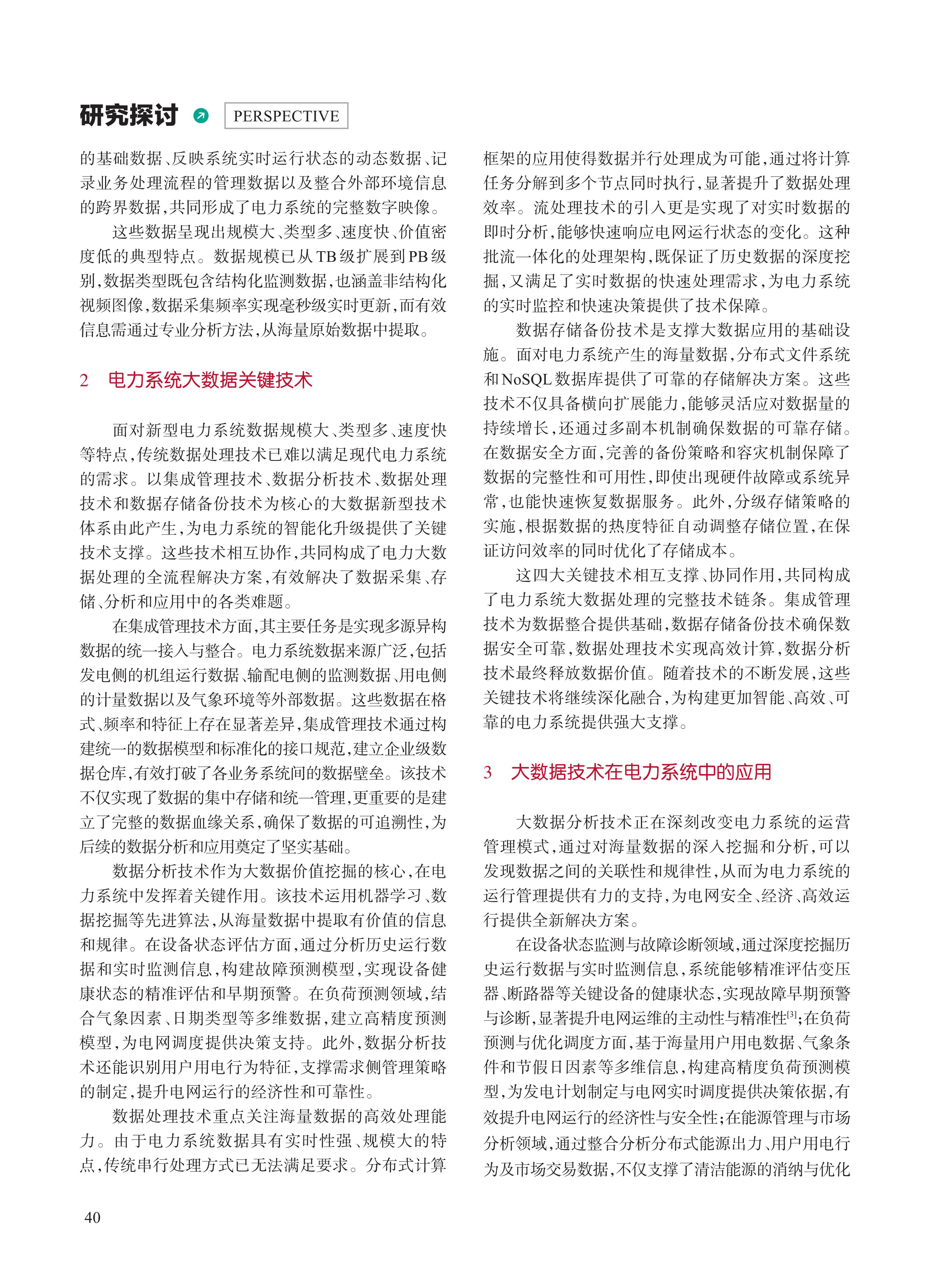 随着新型电力系统建设的推进,源、网、荷、储各环节产生的海量数据呈现出爆炸式增长的趋势,具有规模大、类型多、速度快、价值密度低等特点 。文中系统探讨了大数据技术在电力系统中的创新应用与发展前景,总结了电力大数据的关键技术,综述了在状态监测与故障诊断、负荷预测与优化调度、能源管理与市场分析三大核心领域的研究现状 。虽然大数据技术已显著提升电网运行效率和安全性,但在数据质量、系统集成等方面仍面临挑战。未来,随着数字孪生、人工智能等新技术融合发展,大数据技术将持续推动电力系统向数字化、智能化方向转型升级,为构建新型电力系统提供关键技术支撑。