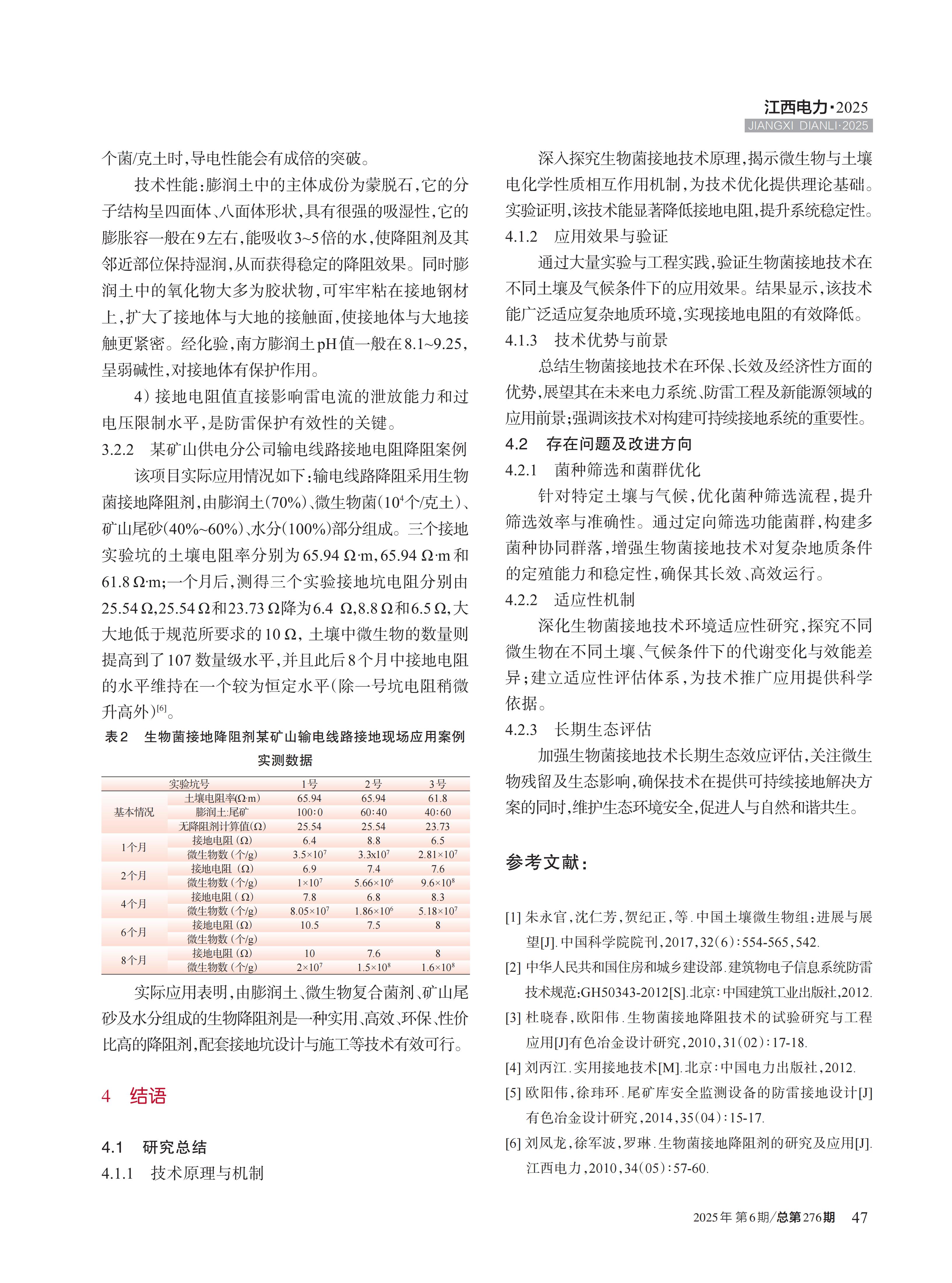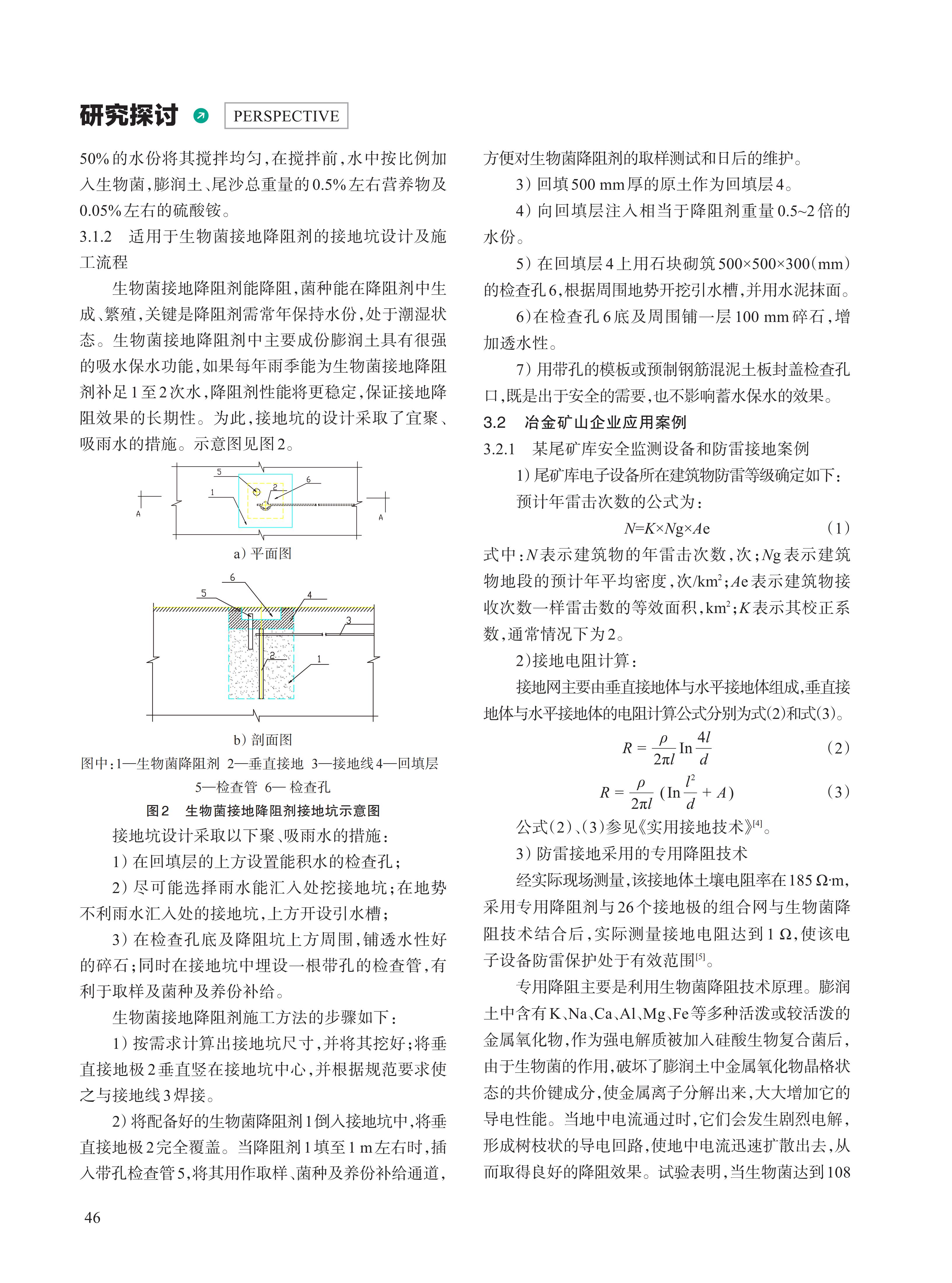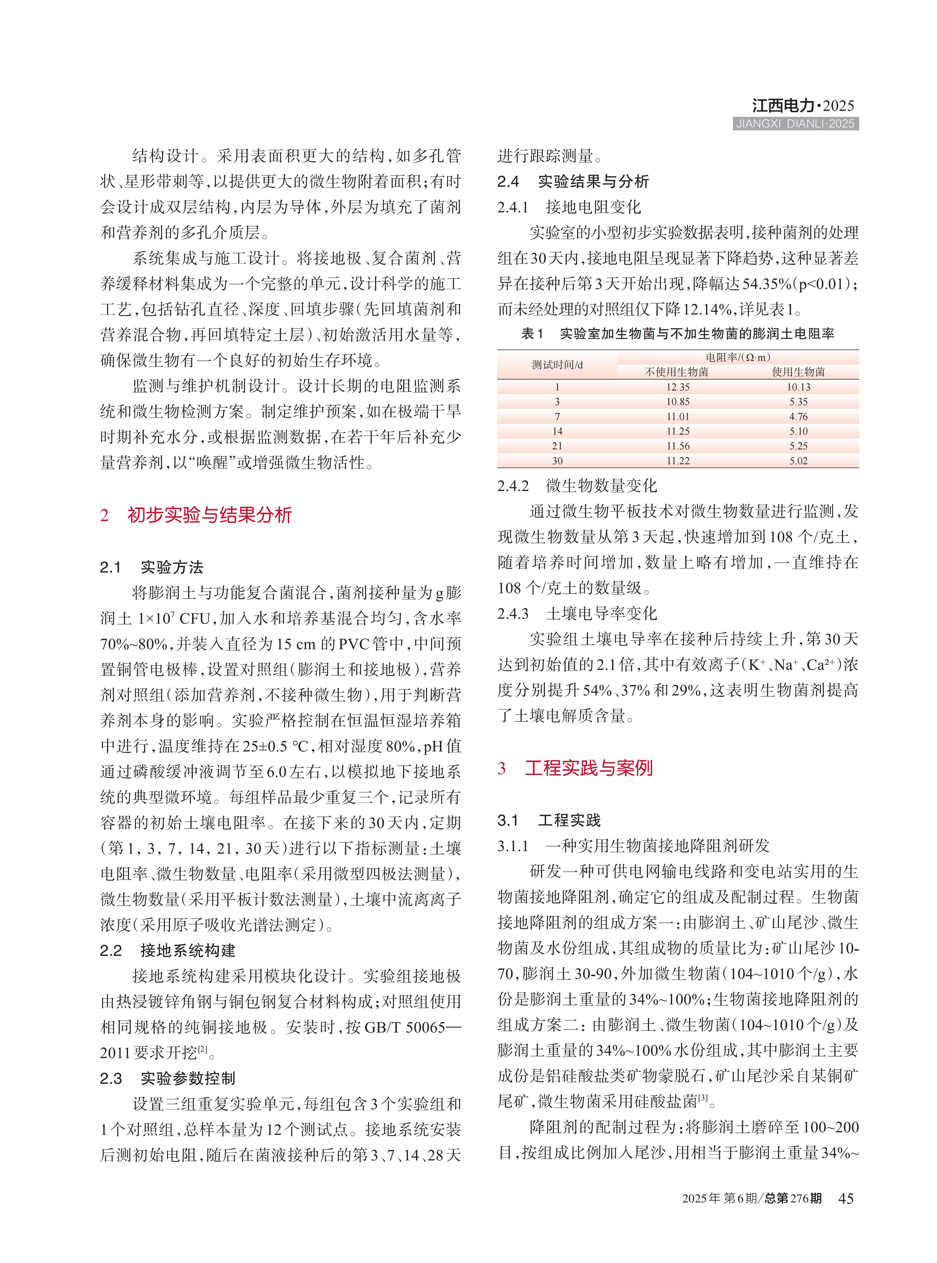 接地系统是保障电力设施、建筑和人员安全的核心环节,降低接地电阻一直是工程实践的难点 。传统化学和物理降阻剂存在污染环境、强腐蚀和持续性差等问题 。近年来,生物菌接地降阻技术引起人们广泛关注 。文中重点介绍生物菌接地技术的相关原理,基于功能复合菌的微生物接地降阻技术,结合实验数据分析与工程实践,观察接地电阻变化,通过分析实验参数对降阻效果的影响,提出了优化接地电阻的策略,并应用于冶金矿山企业防雷接地中,为生物菌接地降阻技术进一步提高提供一定的借鉴。