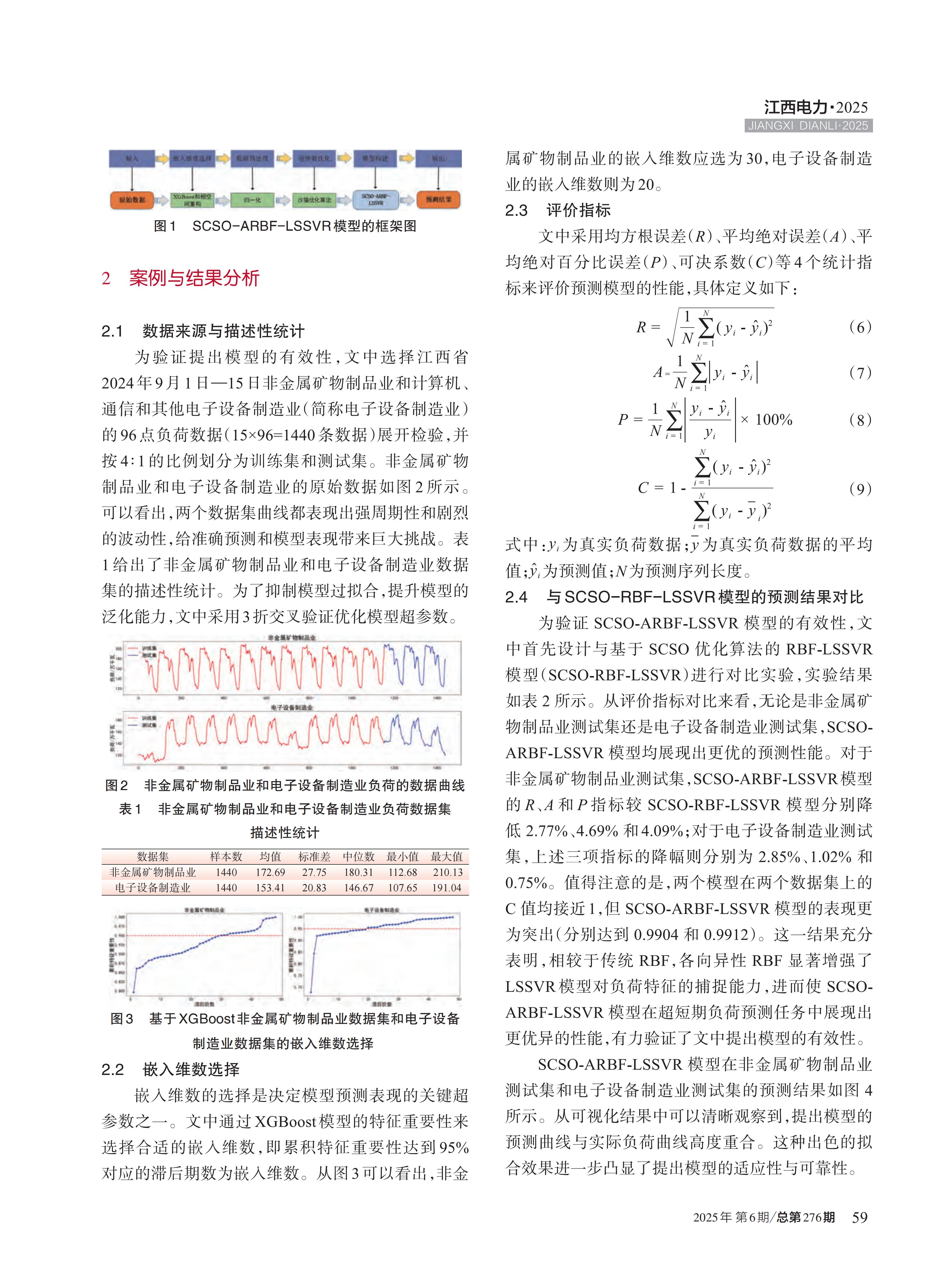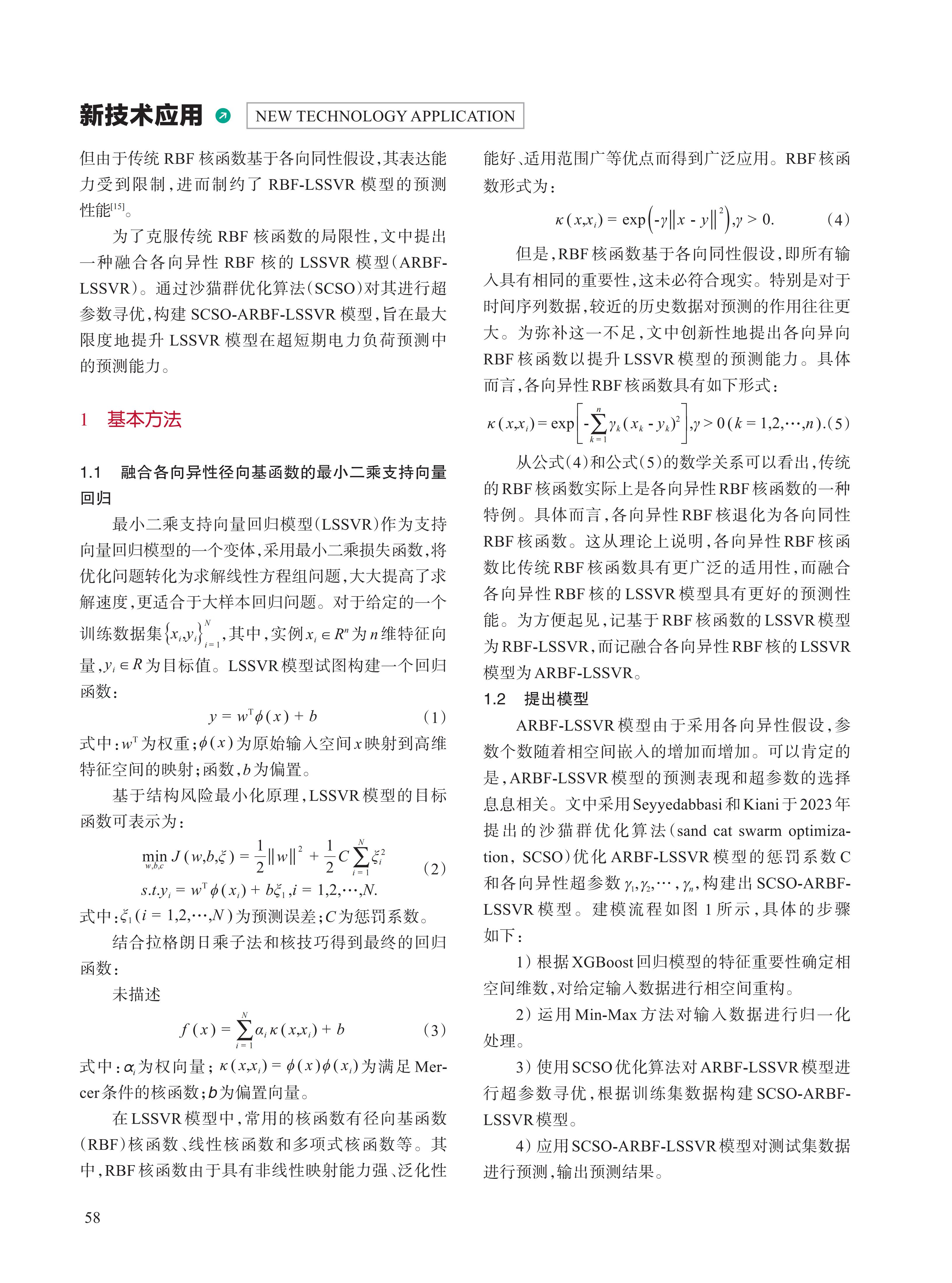 随着电力系统规模扩张与复杂度攀升,精准的超短期电力负荷预测对系统稳定运行和经济调度的重要性日益凸显。针对基于径向基函数(RBF)核最小二乘支持向量回归(LSSVR)模型的局限,文中创新性提出融合各向异性RBF核的 LSSVR模型(ARBF-LSSVR),并引入沙猫群优化算法(SCSO)进行参数寻优,构建 SCSO-ARBF-LSSVR模型。基于江西省 2024 年 9 月两个行业的 96点数据集,对所提出模型的有效性展开验证。实证结果显示:在 1步、3步负荷预测中,SCSO-ARBF-LSSVR模型的预测表现均显著优于其他基准模型。这一结果充分说明 SCSO-ARBF-LSS- VR模型优异的预测能力与良好的应用前景,为电力系统的高效运行与科学规划提供强有力的技术支撑。