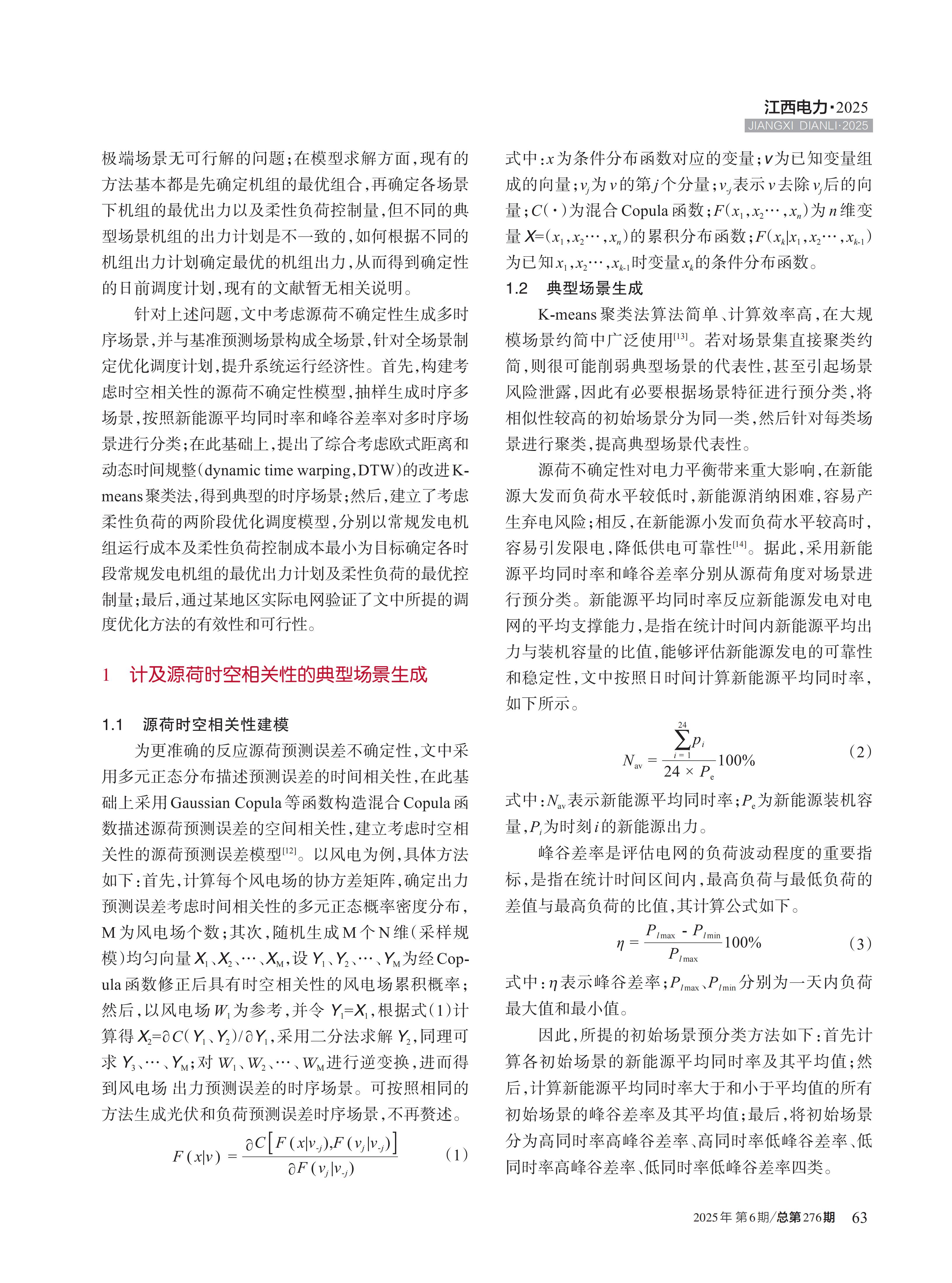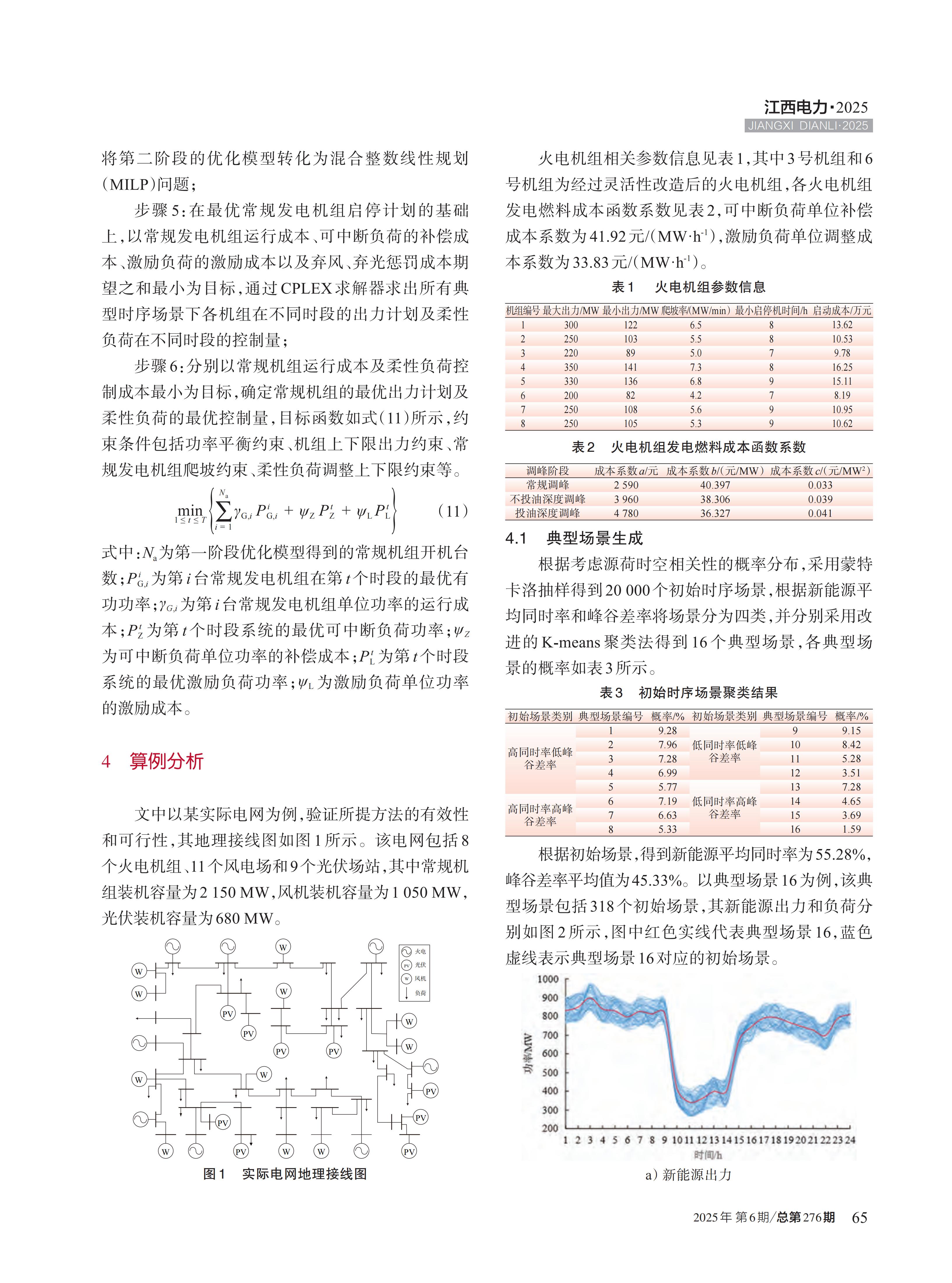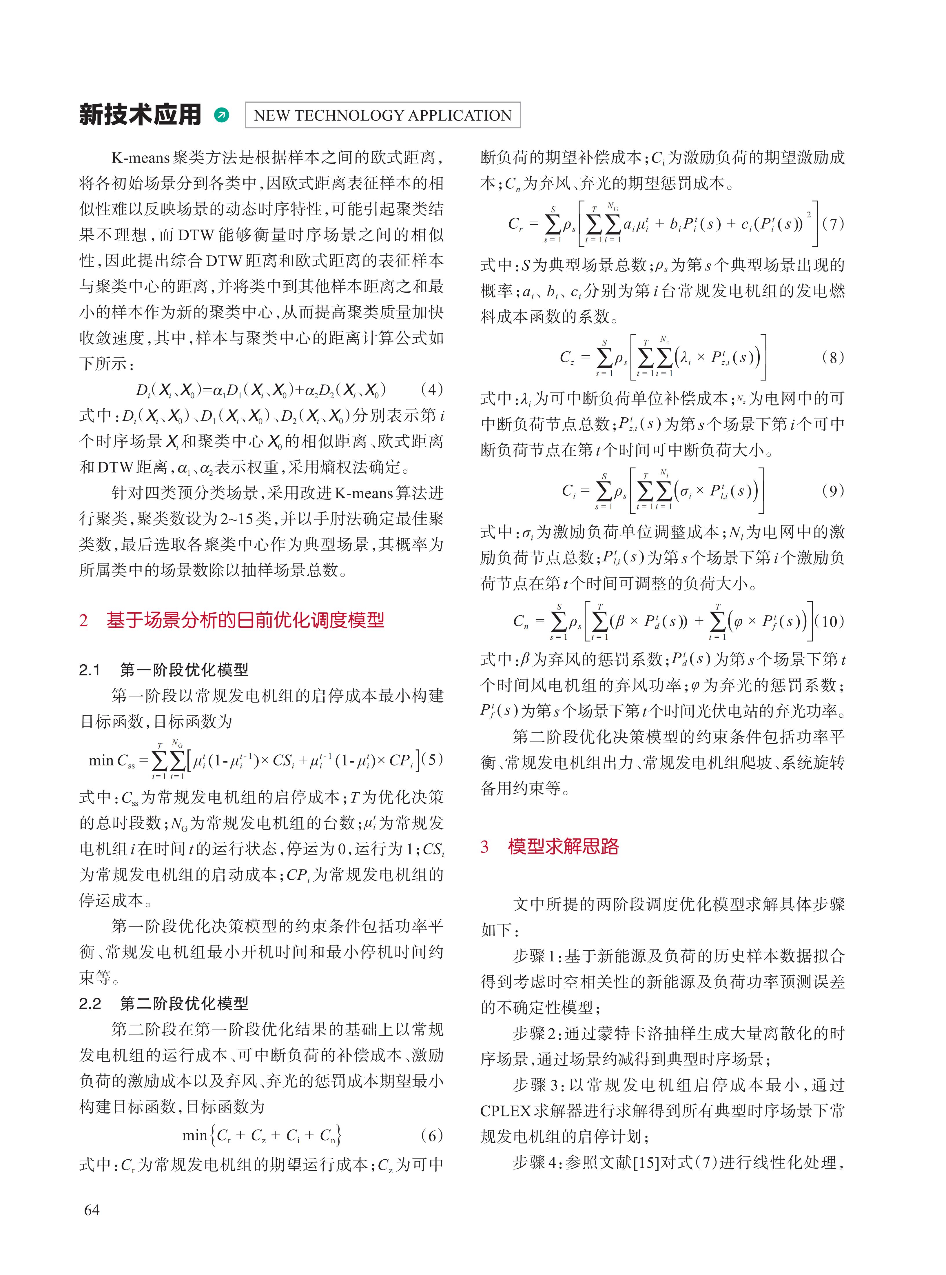 为解决场景分析法在考虑源荷不确定性的日前优化调度中,存在高风险场景泄露、无可行解及最优调度计划难以确定的问题,提出了考虑柔性负荷的电力系统全场景日前优化调度方法 。根据新能源平均同时率和峰谷差率对时序场景集进行分类,并通过综合考虑欧式距离和动态时间规整的改进 K-means 聚类法,得到典型的时序场景;进一步建立了考虑柔性负荷的两阶段优化调度模型,在模型求解时,首先确定所有典型场景下常规机组的最优启停计划,以及不同场景下机组的出力计划和柔性负荷控制量;在此基础上,分别以常规发电机组运行成本及柔性负荷控制成本最小化确定各时段常规发电机组的最优出力计划及柔性负荷的最优控制量,得到日前调度计划;最后通过实际电网算例,验证了所提日前调度优化方法的可行性和有效性。